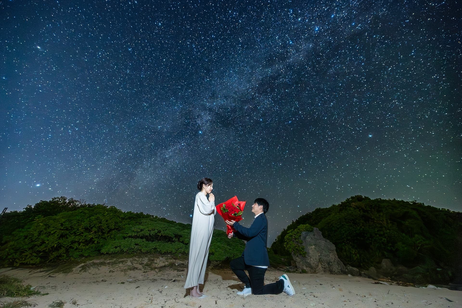 サンセットや星空といった沖縄の自然環境、客室装飾や花束、メッセージプレート付きディナーなどの演出を組み合わせることで、唯一無二のプロポーズ体験を実現しています。