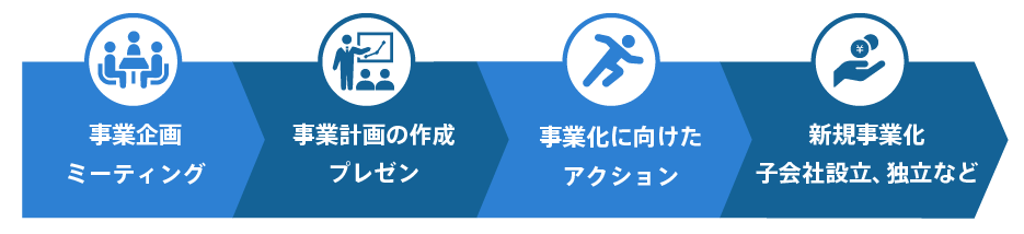 事業案が固まれば、まずは実現に向けた行動を開始。うまく軌道に乗れば事業化も夢じゃないかもしれません。最終的にはそれぞれの希望に合わせ子会社設立や独立も視野にいれています。