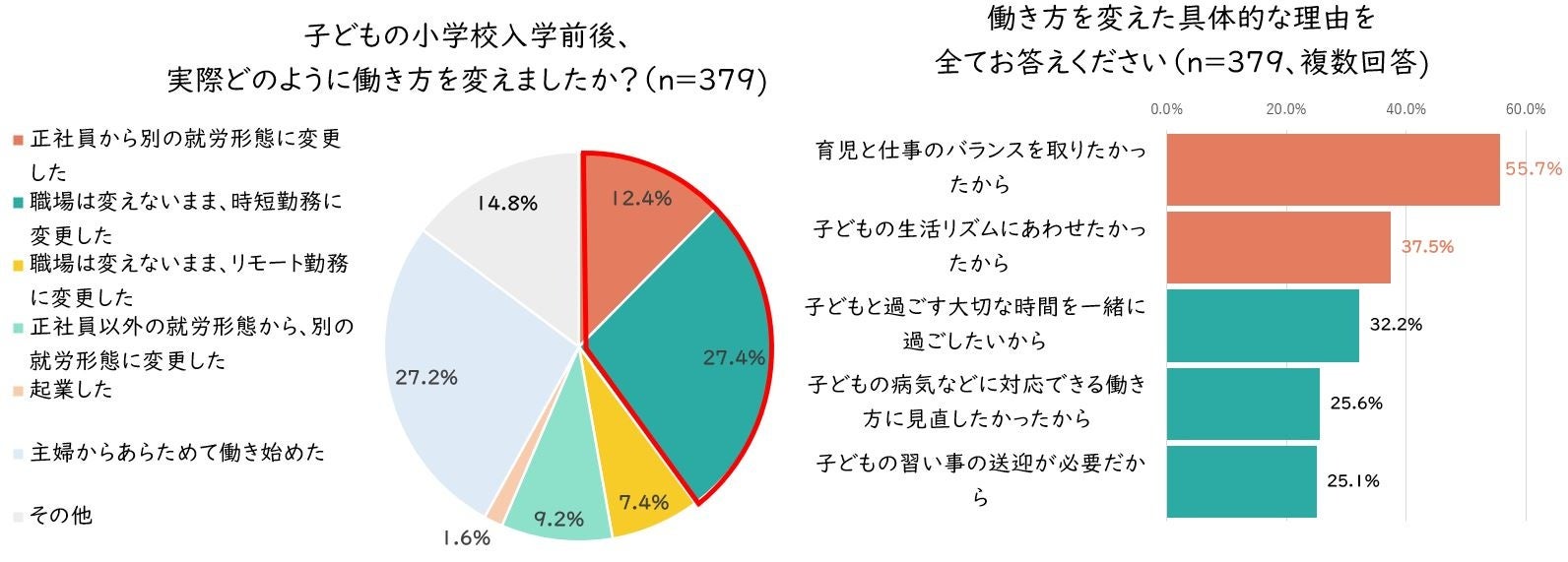 子どもの小学校入学にあたって、過半数の方が「働き方の見直しを検討(50.7%)」、全体の37.9%が実際に働き方を変えたと回答しました。働き方を変えた人のうち約4割が、時短勤務に変更(27.4%)や正社員から別の雇用形態へ変更(12.4%)など、子育てと仕事のバランスや、子どもの生活リズムに合わせるため、柔軟な働き方を求めて就労形態を見直していました。