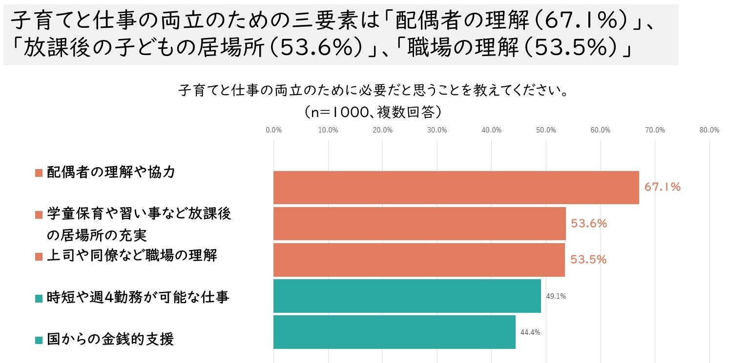 小学生の子どもを持つ働く女性の多くが、子育てと仕事の両立に悩み、「小1の壁」で心身にストレスを感じながらも、家計を支えるために懸命に働いている姿が浮き彫りとなりました。そして、子育てと仕事の両立に必要なものを尋ねたところ、「配偶者の理解(67.1%)」、「放課後の子どもの居場所(53.6%)」、「職場の理解(53.5%)」が必要というニーズが得られました。