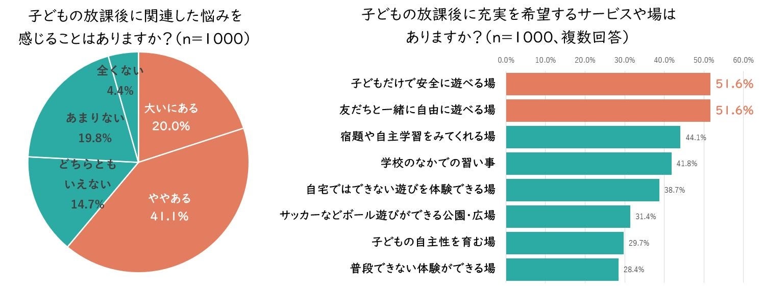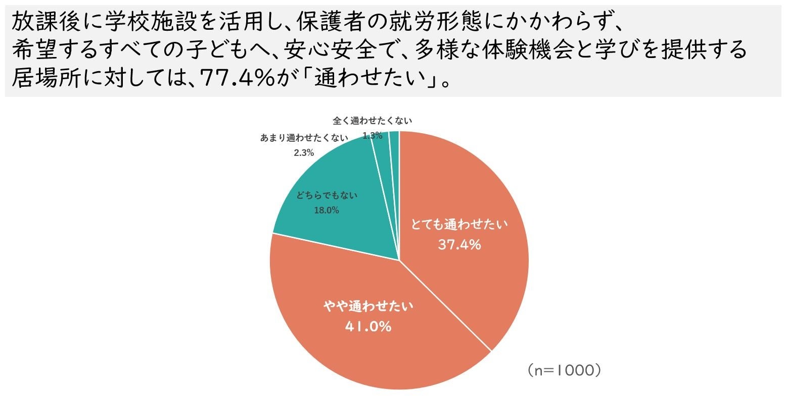 子どもの放課後に関しては、61.1%の人が悩みを感じていると答えました。具体的な要望としては、半数以上が「子どもだけで安全に遊べる場」や「友達と一緒に自由に遊べる場」が欲しいと回答。「宿題や自主学習をみてくれる場(44.1%)」や「学校のなかでの習い事(41.8%)」にも要望が集まりました。また、放課後に学校施設を活用し、保護者の就労にかかわらず、希望する全ての子どもへの安心安全で、多様な体験機会と学びの機会のある居場所に対しては、78.4%が「通わせたい」と回答しました。