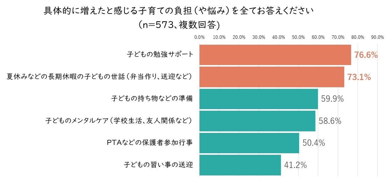 また、子どもの小学校入学によって「子育ての負担(や悩み)が増えた」と57.3%が回答。子育ての負担が増えた理由として、「子どもの勉強サポート(76.6%)」、「夏休みなどの長期休みのケア(73.1%)」など、保育園時代には経験が少なかった悩みが上位にあがりました。家事・子育てに費やす時間が増えた人の中には、「イライラする、ストレスを感じるようになった(66.7%)」や「自分の体調不良が起きた(26.5%)」といった心身の不調を感じるケースも見受けられました。