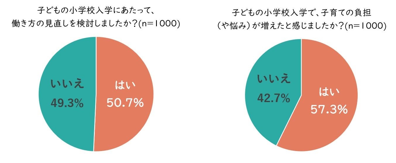 - 子どもの小学校入学にあたって過半数が「働き方の見直しを検討(50.7%)」、「子育ての負担(や悩み)が増えた(57.3%)」と回答