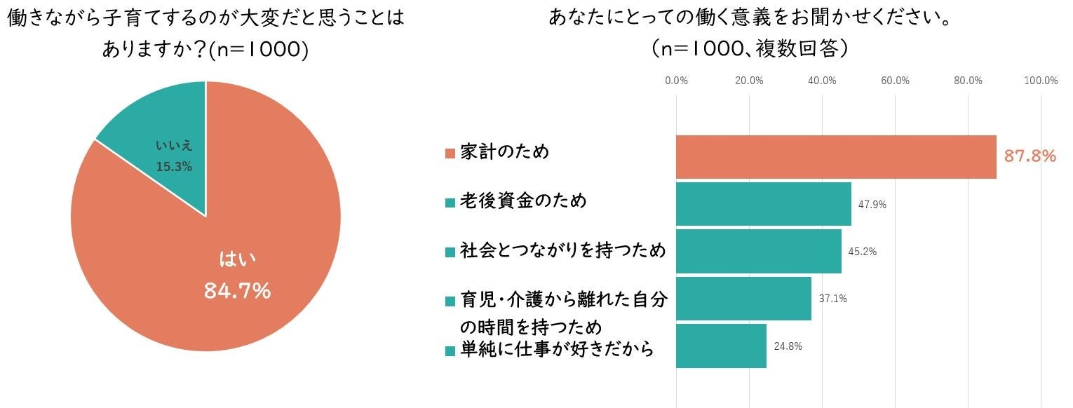 - 子育てと仕事の両立は大変(84.7%)と感じつつも、家計のために働く(87.8%)