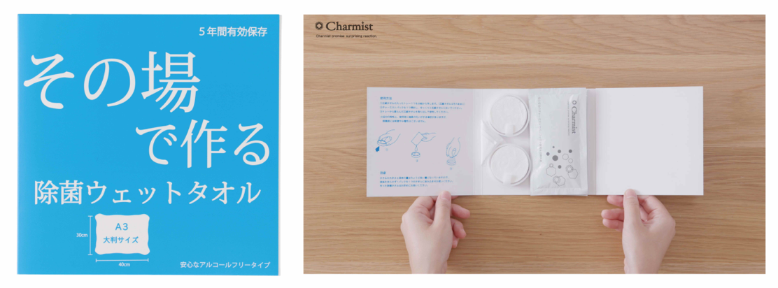 その場で作る除菌ウエットタオル(実用新案登録:第3226421号)は高い除菌効果と安全性をもつチャーミストと、圧縮された固形タオルのセットになり、災害時における避難所等での衛生面をケアできる商品です。