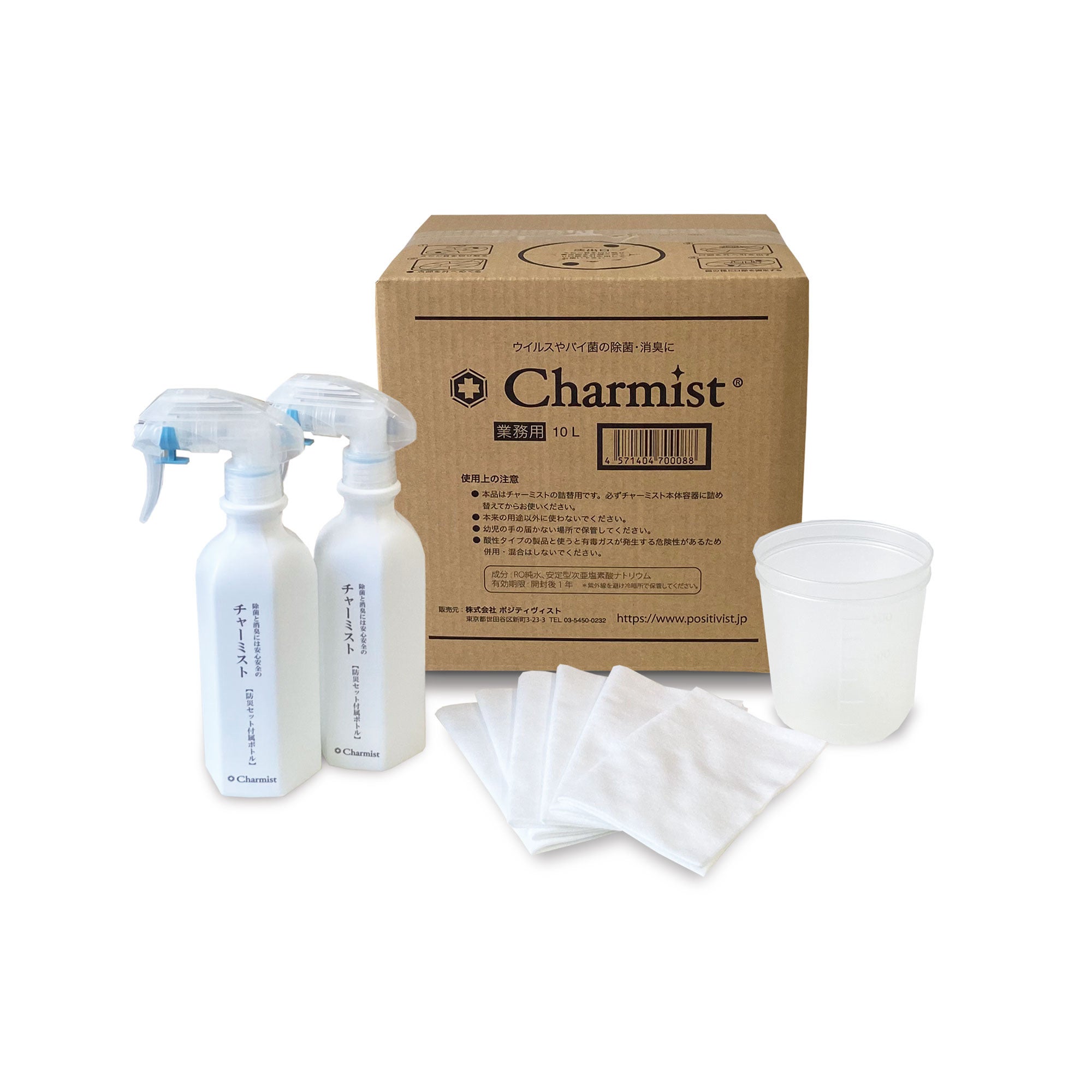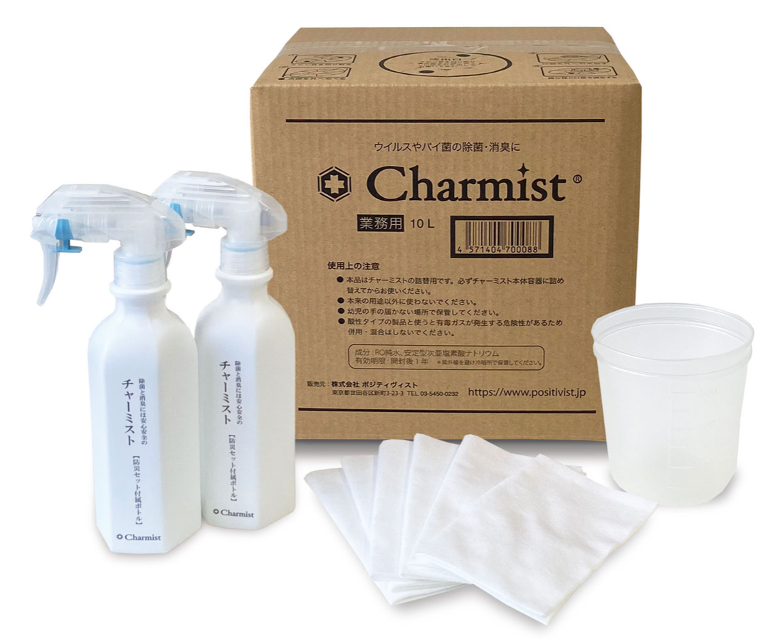 「除菌消臭剤チャーミスト10L 防災セット」は、高い除菌力と安全性、長期保存力(=5年保管可能)に優れた除菌消臭剤チャーミスト(以下、チャーミスト)を基本とした防災用セットです。1パッケージにチャーミスト10L、スプレーボトル、計量カップ、清拭用不織布クロスが含まれています。