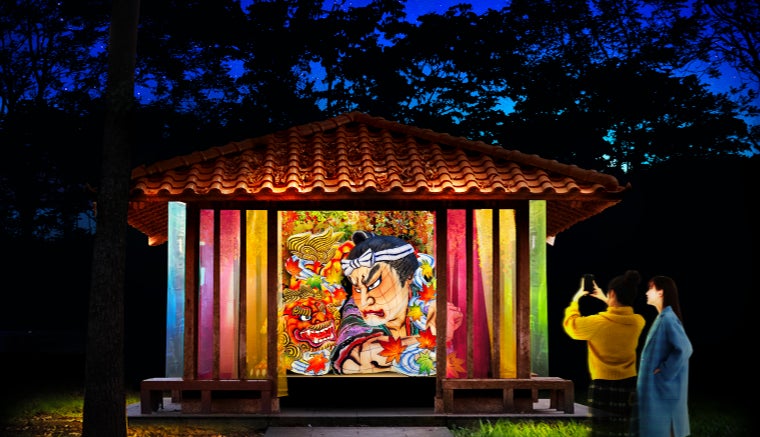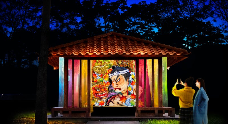 ※ねぶたの展示される東屋周辺には、あかりの造形作家・川村忠晴(かわむら ただはる)氏による「秋の草花の行灯」が優しく林を照らします。