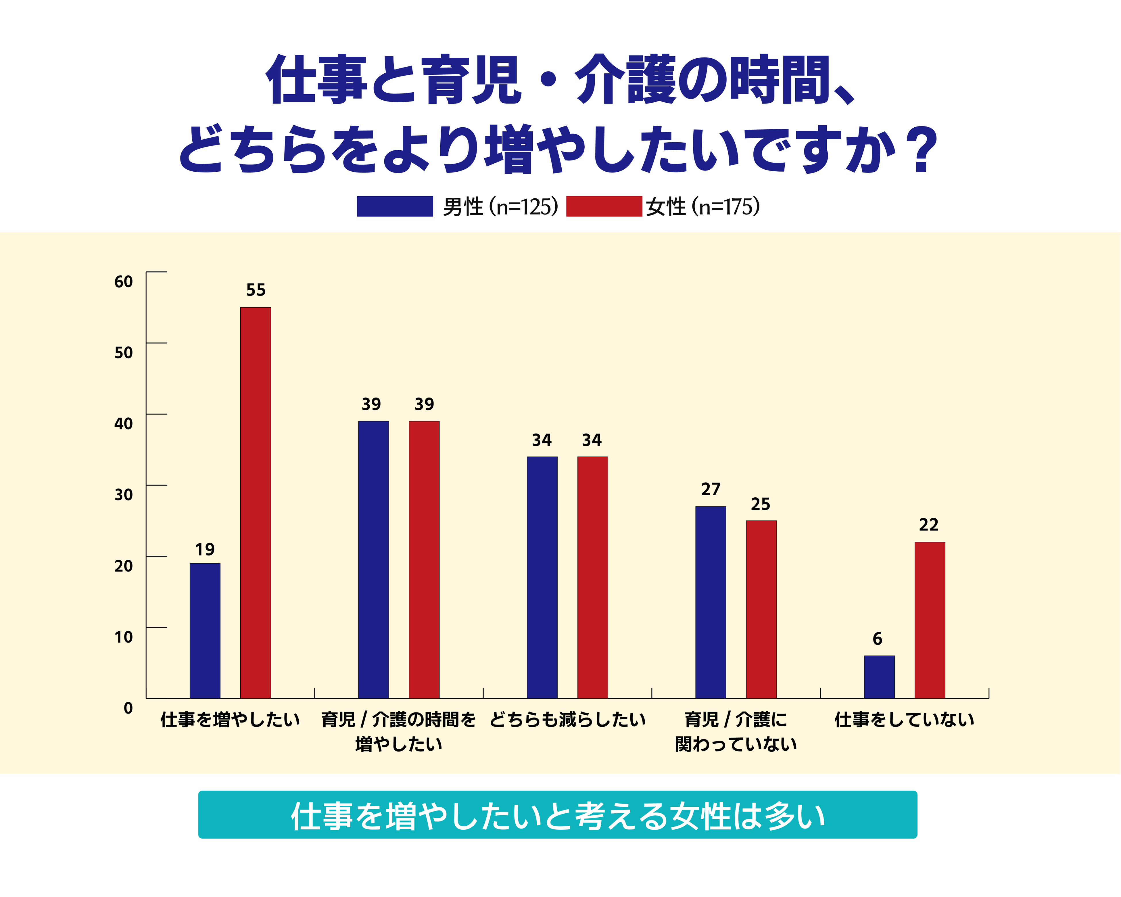 「育児・介護」より「仕事」を増やしたい女性が多い