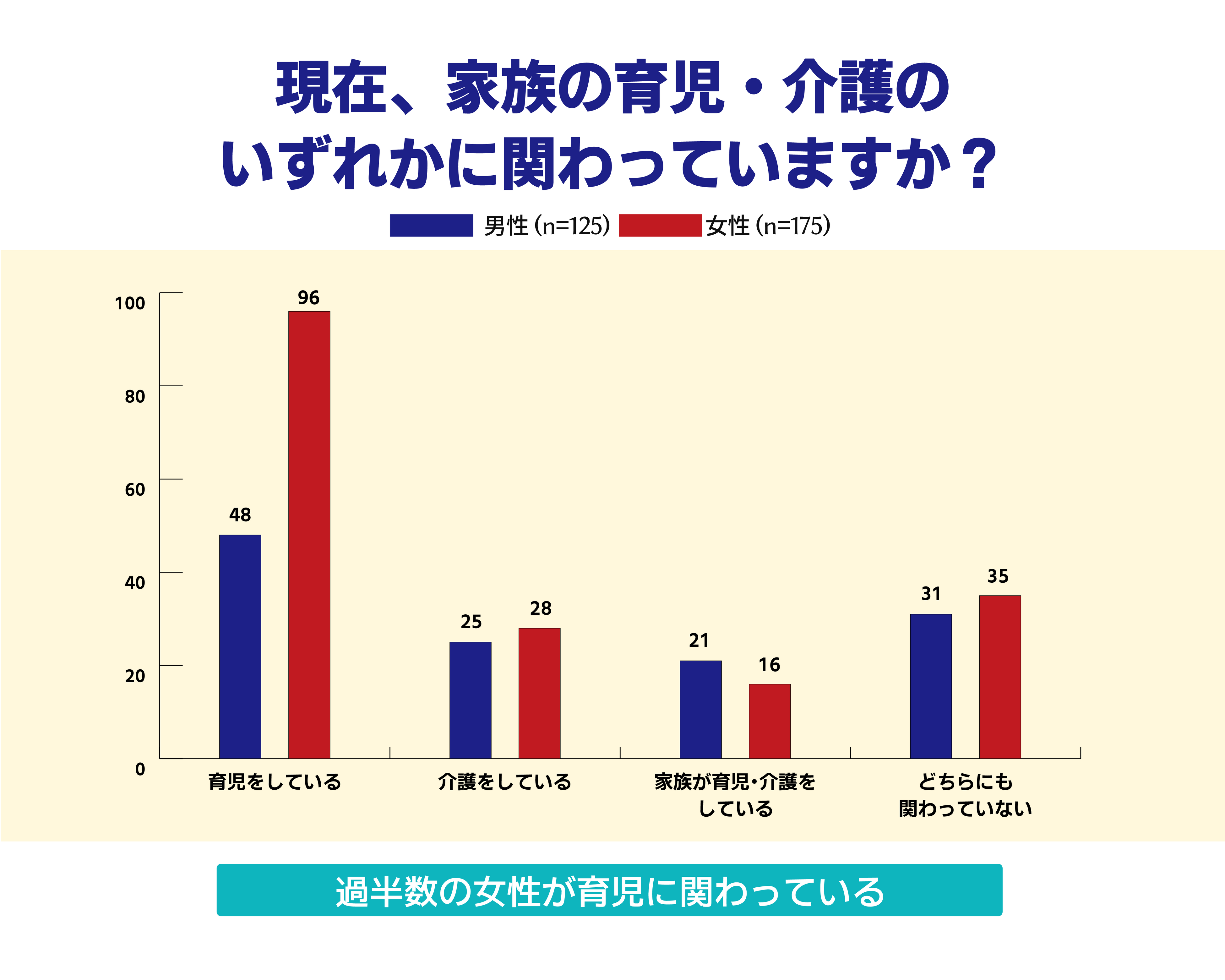 「育児をしている」と回答したのは男性48人(38.4%)、女性96人(54.9%)と、女性回答者の過半数が現在も育児に関わっているのが分かりました。