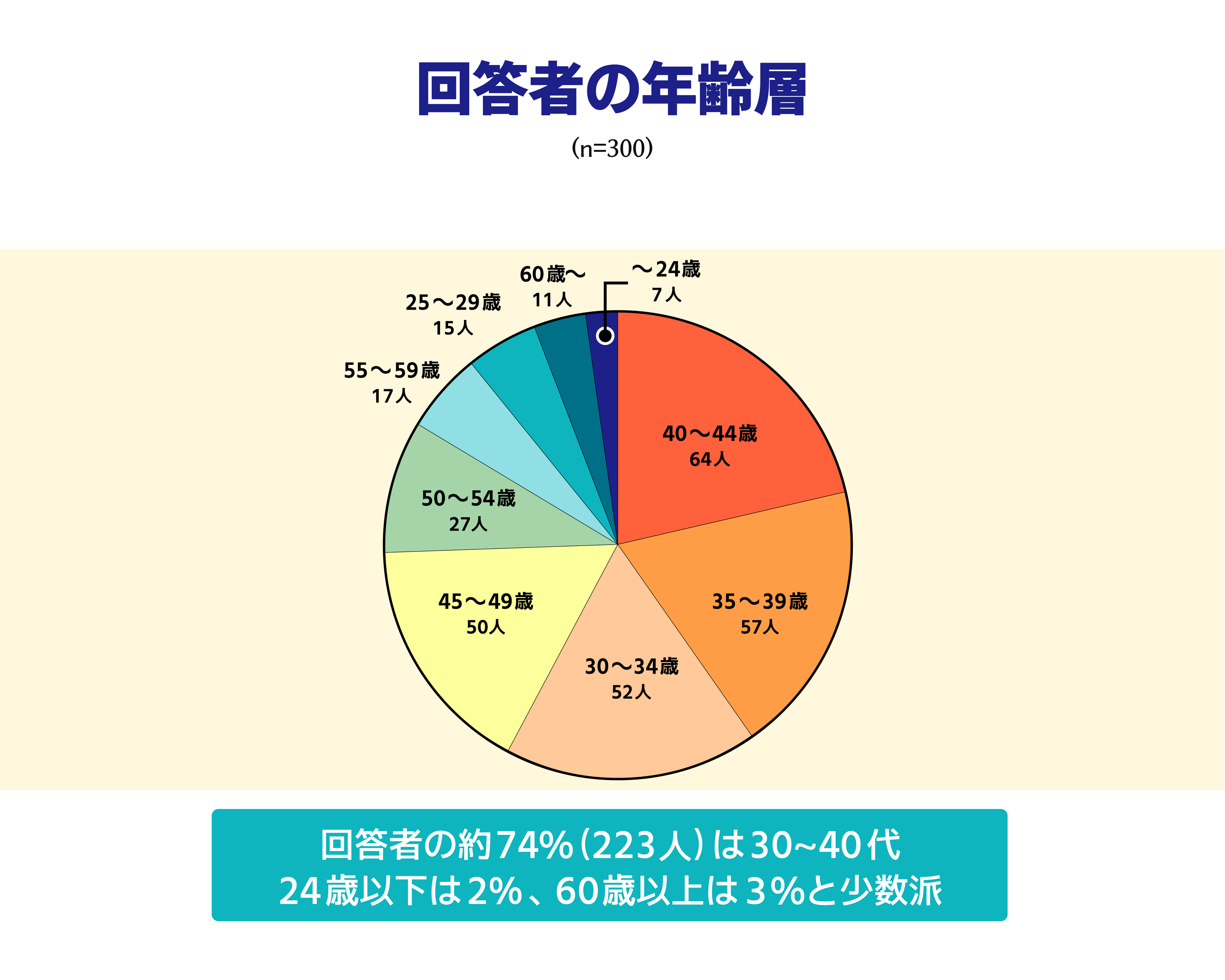 今回の調査に回答した300人のうち、30代が109人(36.3%)、40代が114人(38.0%)となりました。