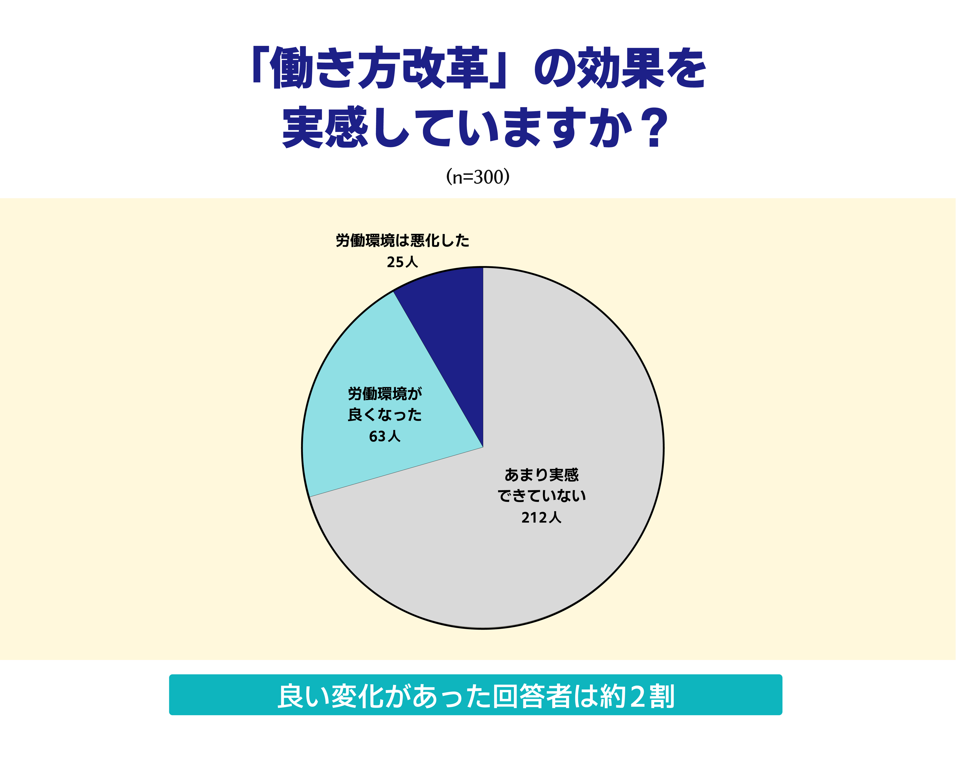 働き方改革によって起こった変化を実感できていない回答者が212人(70.6%)と、大多数を占めました。
