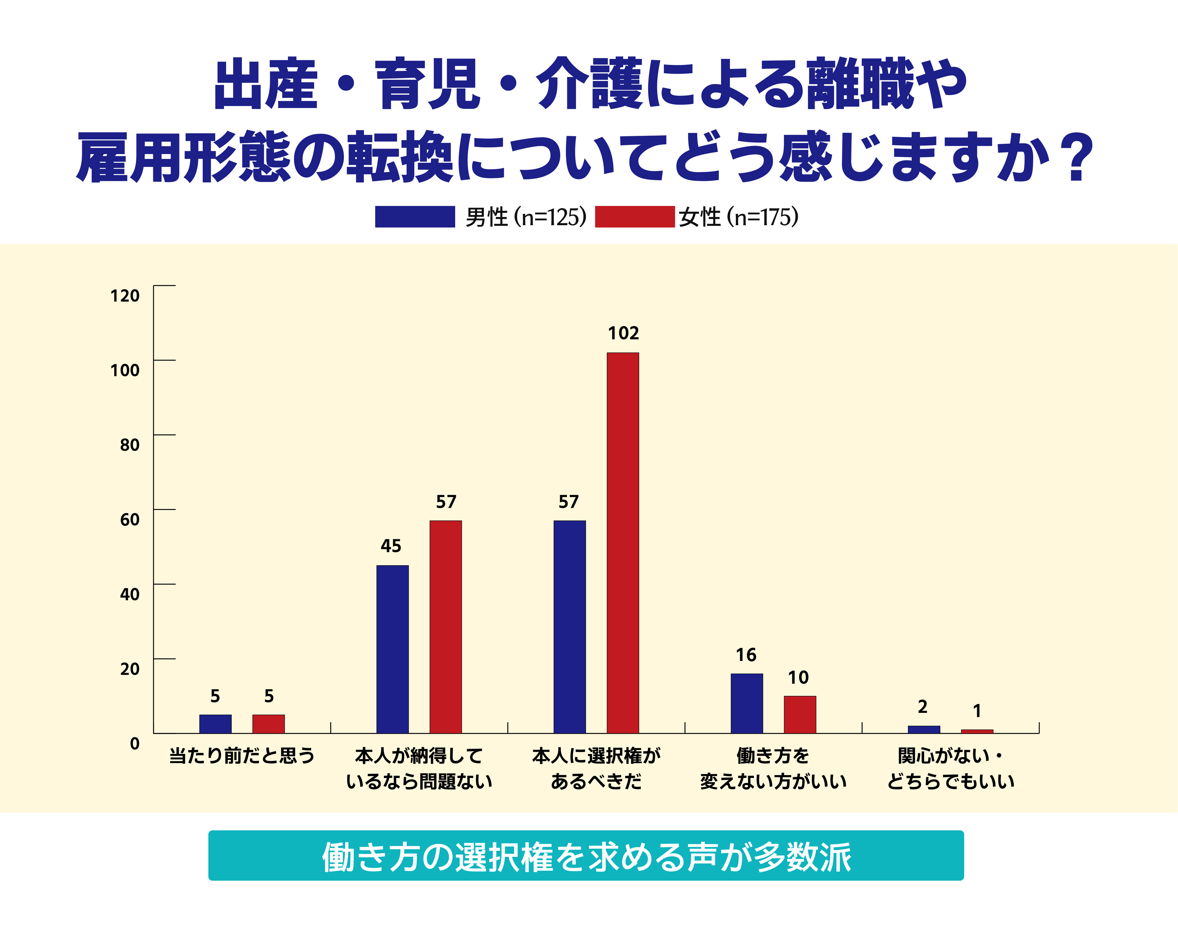 選択権を求める回答が多数派でしたが、「なるべく同じように働き続けたい」のか「自分でできる働き方を選びたい」のかは、現時点では男女差があると考えられるでしょう。