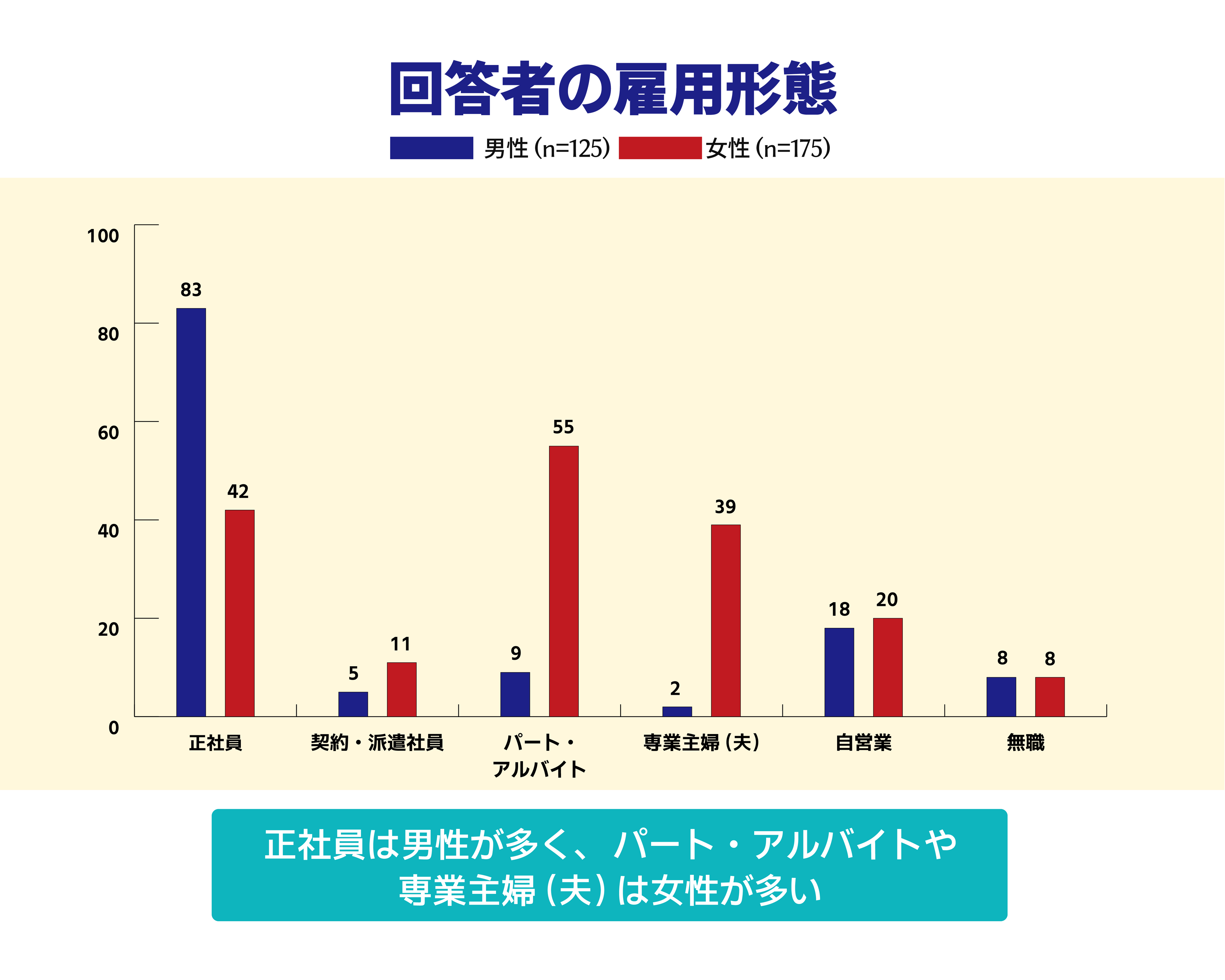 アンケート結果から見ても、男性の正社員は125人中83人(66.4%)、女性の正社員は175人中42人(24.0%)と、大きな差が開いていました。
