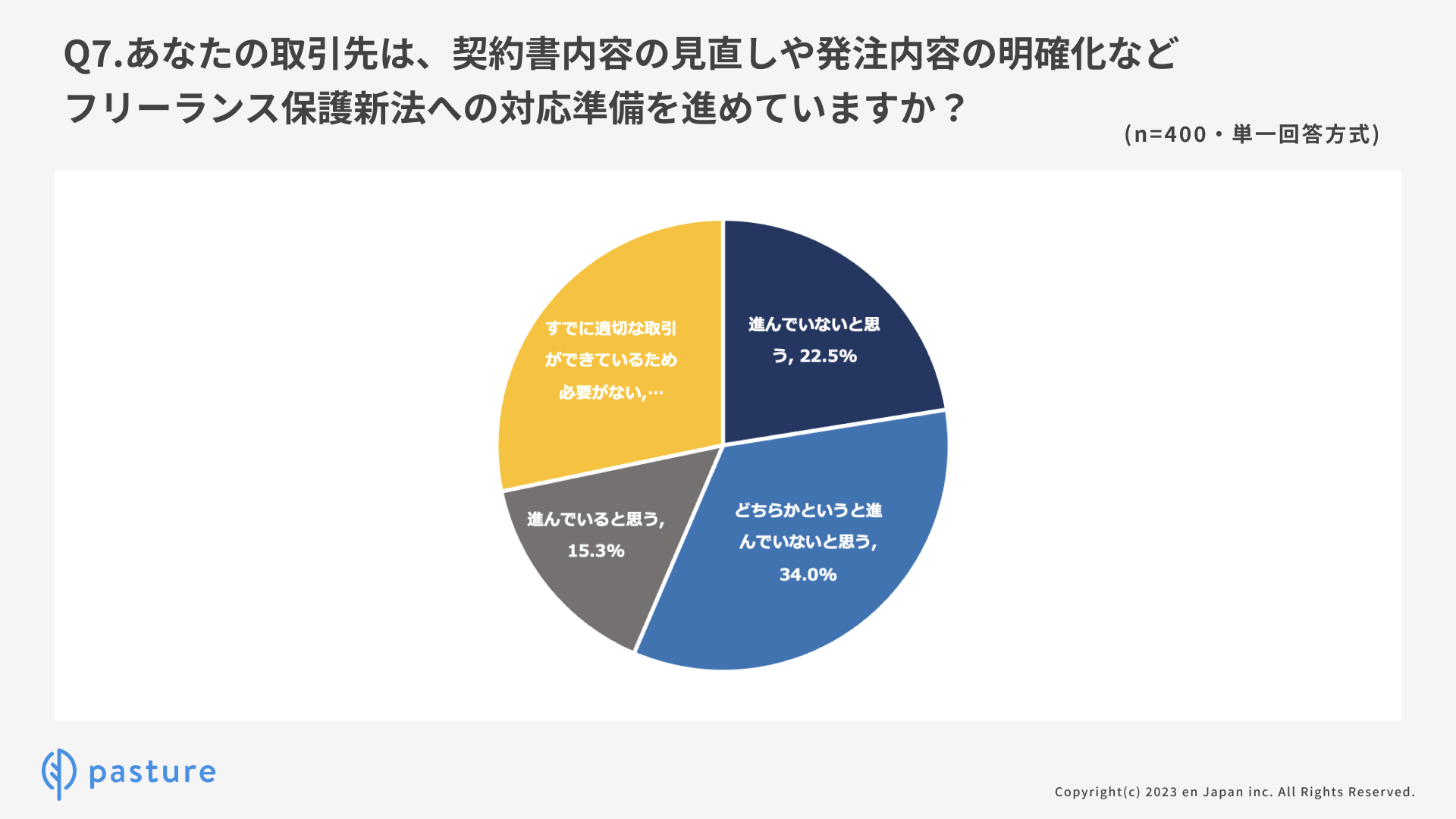 Q7.あなたの取引先は、契約書内容の見直しや発注内容の明確化などフリーランス保護新法への対応準備を進めていますか。(n=400・単一回答方式)