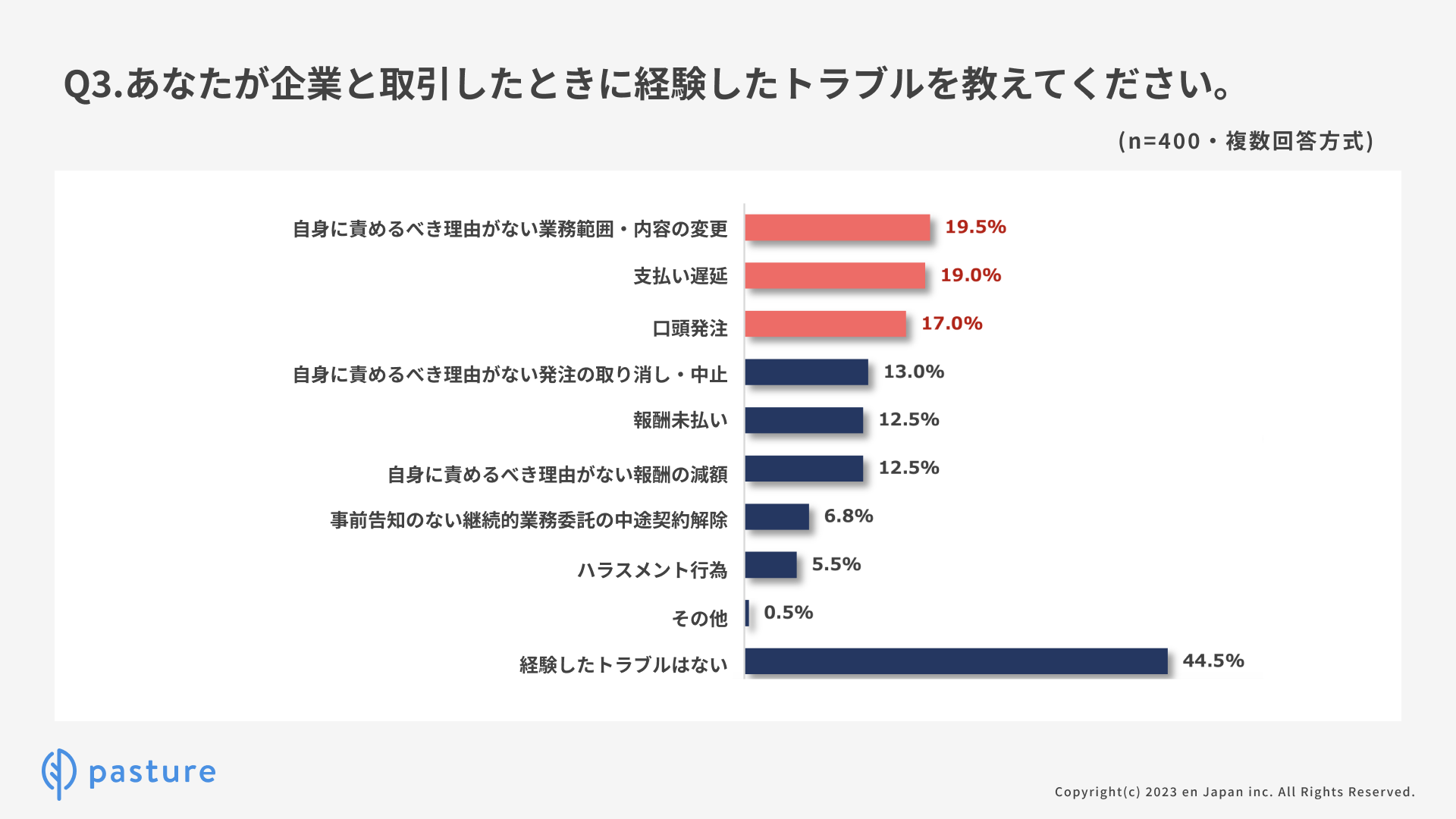 これまで企業との取引で経験したトラブルの内容を質問したところ、最多回答は「あなた自身に責めるべき理由がない業務範囲・内容の変更(19.5%)」、次に「支払い遅延(19.0%)」、「口頭発注(17.0%)」と続きました。