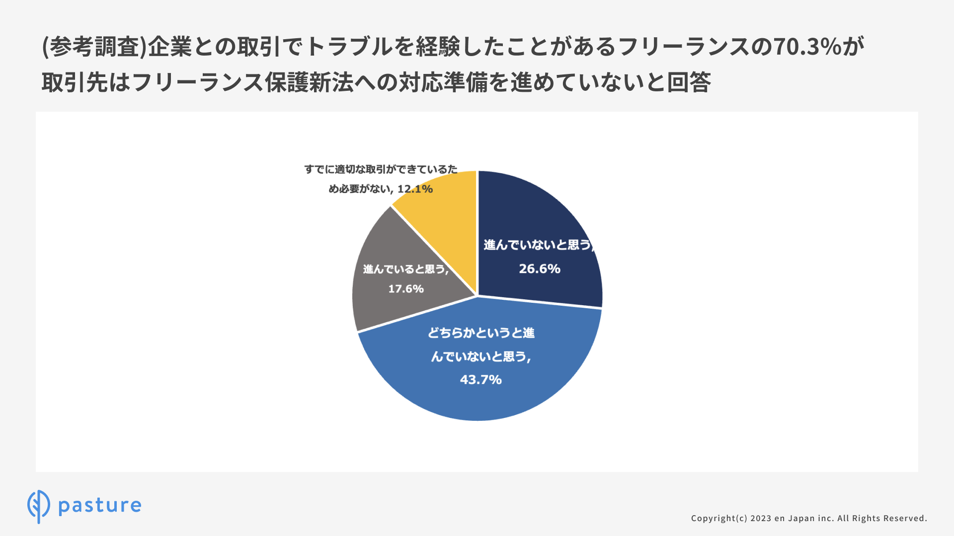 企業との取引でトラブルを経験したことがあるフリーランスの70.3%が、取引先はフリーランス保護新法への対応準備を進めていないと回答