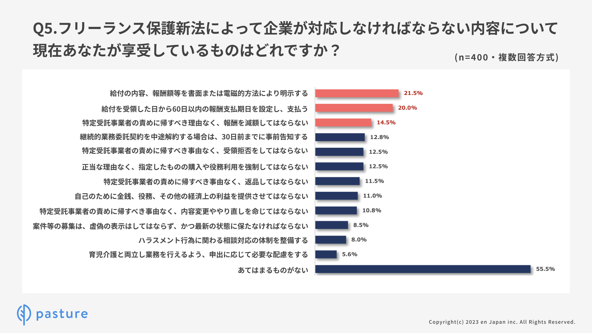 Q5.フリーランス保護新法によって企業が対応しなければならない内容について、現在あなたが享受しているものはどれですか。(n=400・複数回答方式)