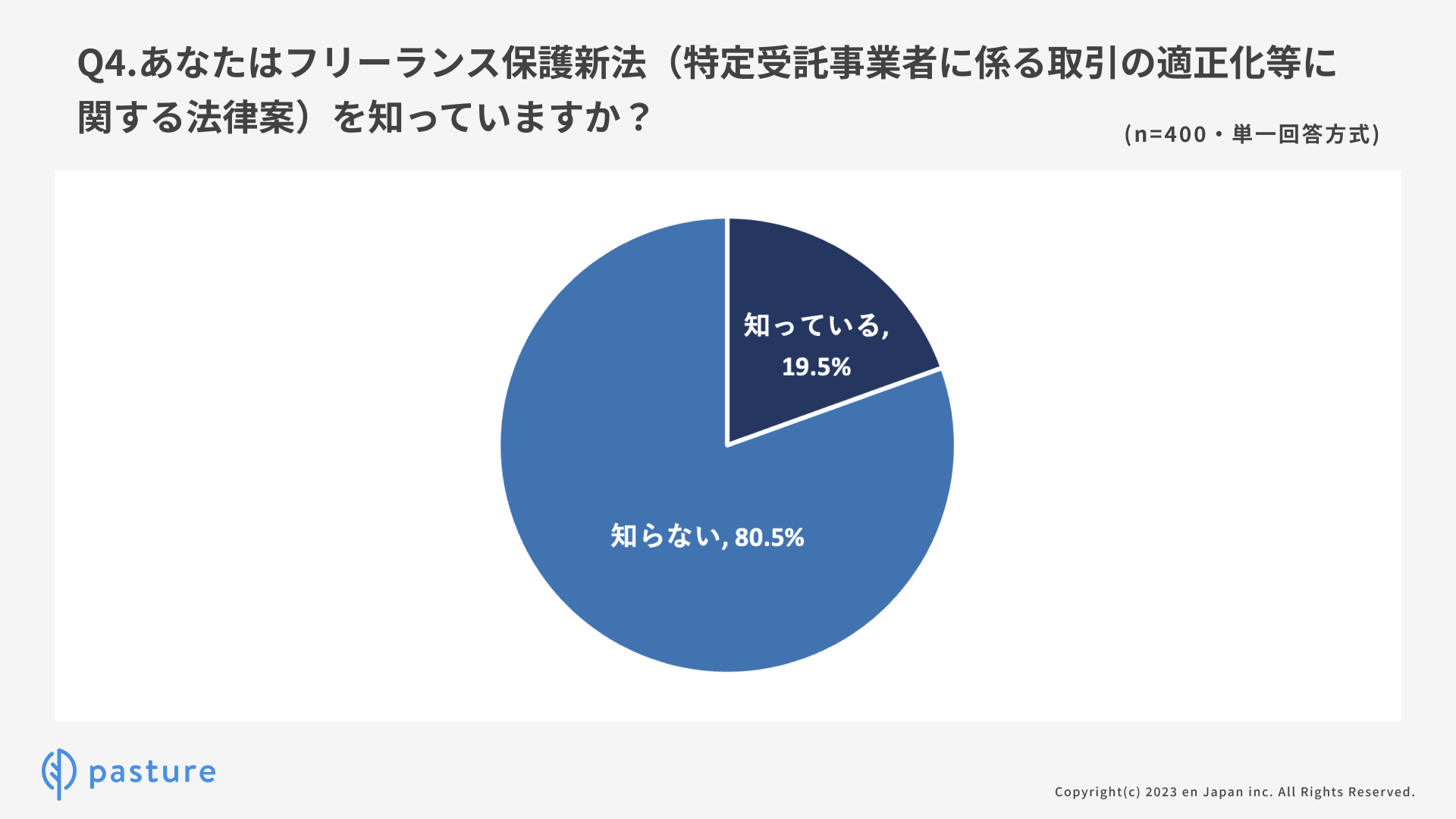全国のフリーランス男女400名を対象に、 2023年4月に成立した「フリーランス保護新法」を知っているか質問したところ、19.5%が「知っている」、80.5%が「知らない」と回答しました。