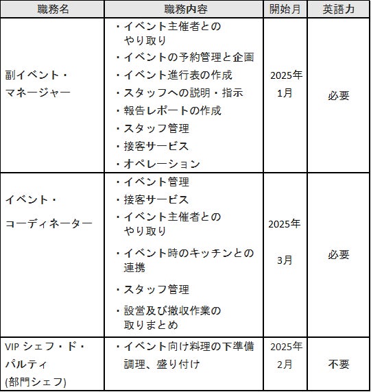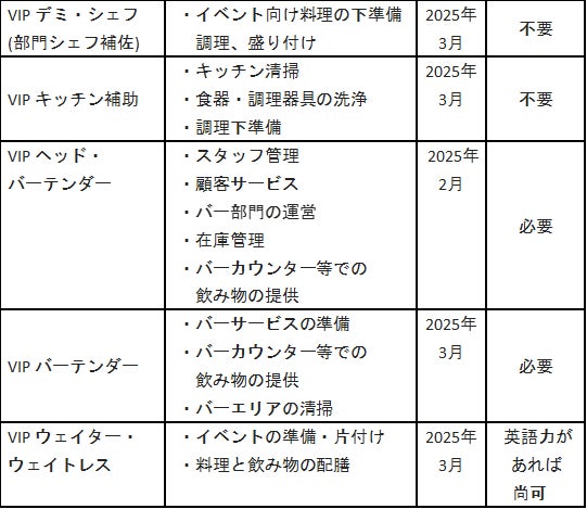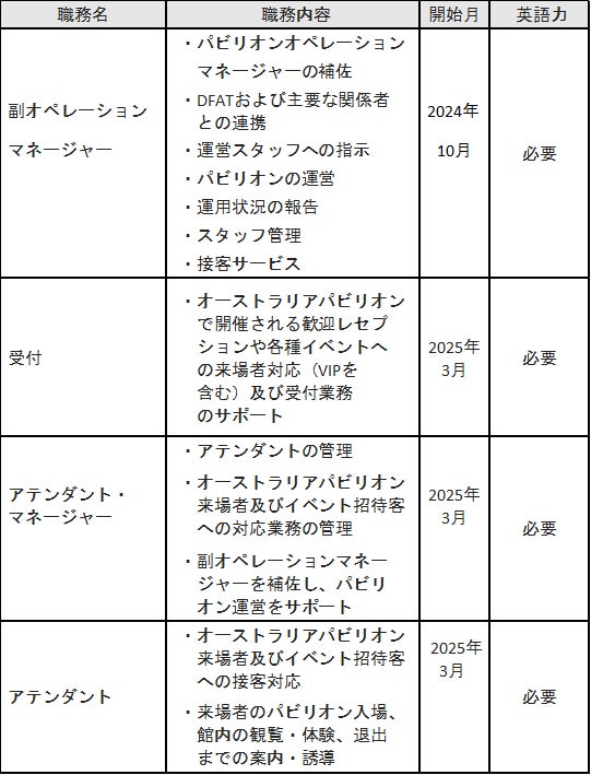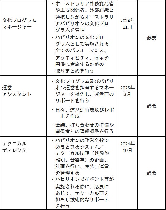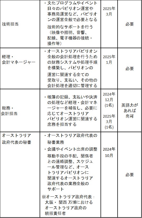 スタッフの勤務期間は2025年3月から開始の職務が大半ですが、一部の職務は2024年後半から開始されます。勤務期間を通じて、大阪・関西万博会場まで通勤可能な地域に居住していること(または滞在すること)が必要です。
