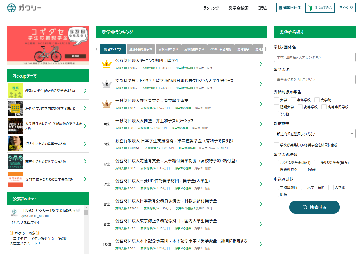 当社の『ガクシー』は、約15,000件の奨学金情報を掲載する国内最大級の奨学金サイトです。高校・大学・大学院・短大・専門・高専学生向け等ほぼすべての奨学金を網羅しており、もらえる・借りる・授業料免除等の奨学金タイプや、申込時期別等、あらゆる奨学金情報を提供しています。