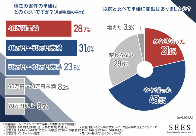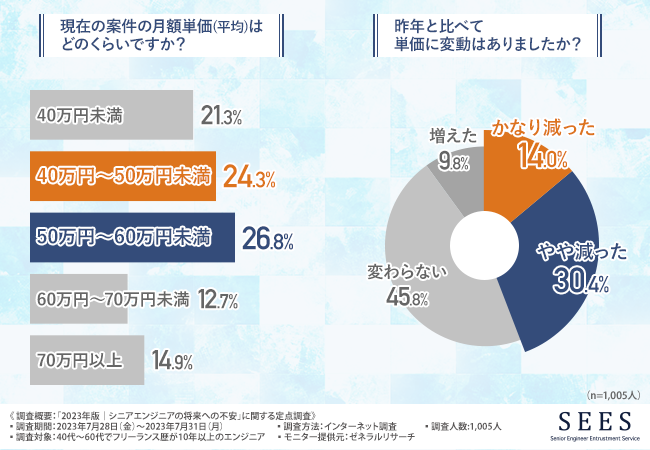 シニアとなっても、これまで築いてきた人脈やノウハウを武器に案件を獲得している様子が窺えた一方で、単価を下げられたり仕事を断られたりするなど、将来、仕事がなくなるかもしれないといった不安を感じていることもわかりました。