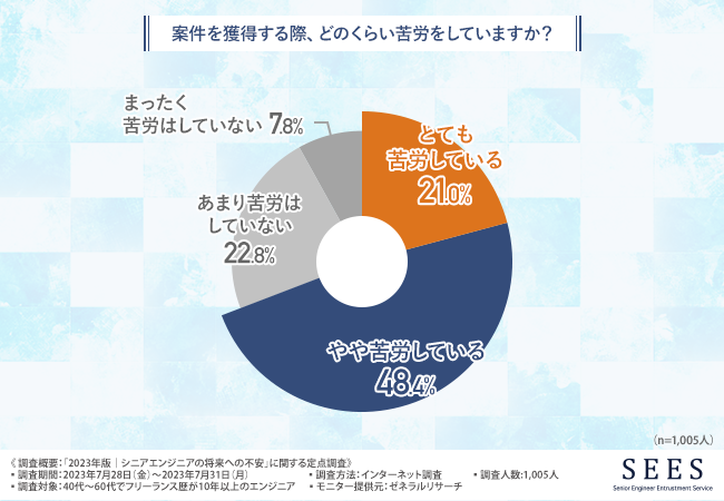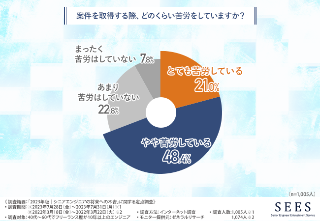 「案件を獲得する際、どのくらい苦労をしていますか?」と質問したところ、『とても苦労している(21.0%)』『やや苦労している(48.4%)』『あまり苦労はしていない(22.8%)』『まったく苦労はしていない(7.8%)』という回答結果になりました。