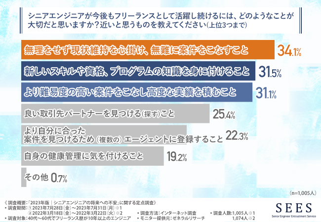 ・シニアエンジニアが今後もフリーランスとして活躍し続けるためには、『無理をせず現状維持を心掛け、無難に案件をこなすこと(34.1%)』が上位に上る
