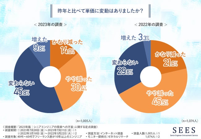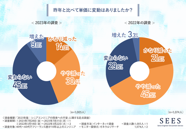 「単価が減った」と回答した方の割合は、2022年67.1%→2023年44.4%と大幅に改善