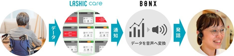 介護施設用デジタル見守りシステム 「LASHIC-care(ラシク)」を提供するインフィック株式会社 (東京本社:東京都千代田区、代表取締役:増田正寿、以下「インフィック」)と、グループトークソリューション「BONX WORK」を提供する株式会社 BONX (東京都渋谷区、代表取締役 宮坂貴大、以下「BONX」)は、LASHIC-care(ラシク)からプッシュ通知する内容を、BONX 音声APIを通じて音声化し、職員のイヤフォンへと発信できるようになったことをお知らせいたします。
