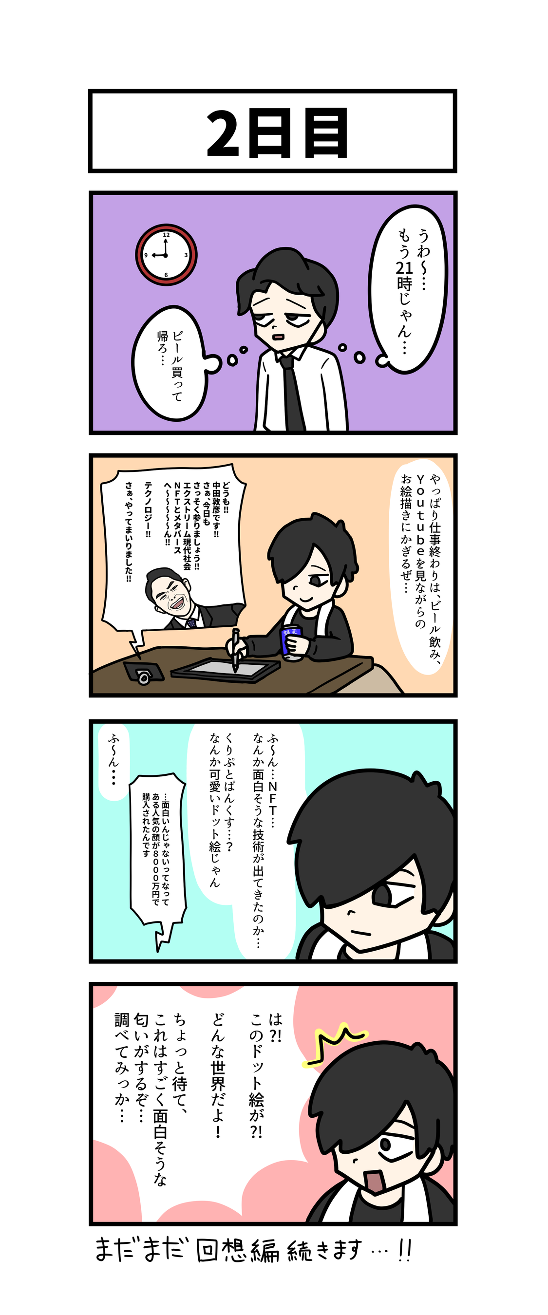 絵で人を笑顔にしたいという幼い頃からの夢を諦め、うだつの上がらない営業マンをしてきたという著者。ある日、偶然NFTという存在を知り、幼い頃からの夢を実現できるかもしれないと考え、NFTに挑戦し始めます。