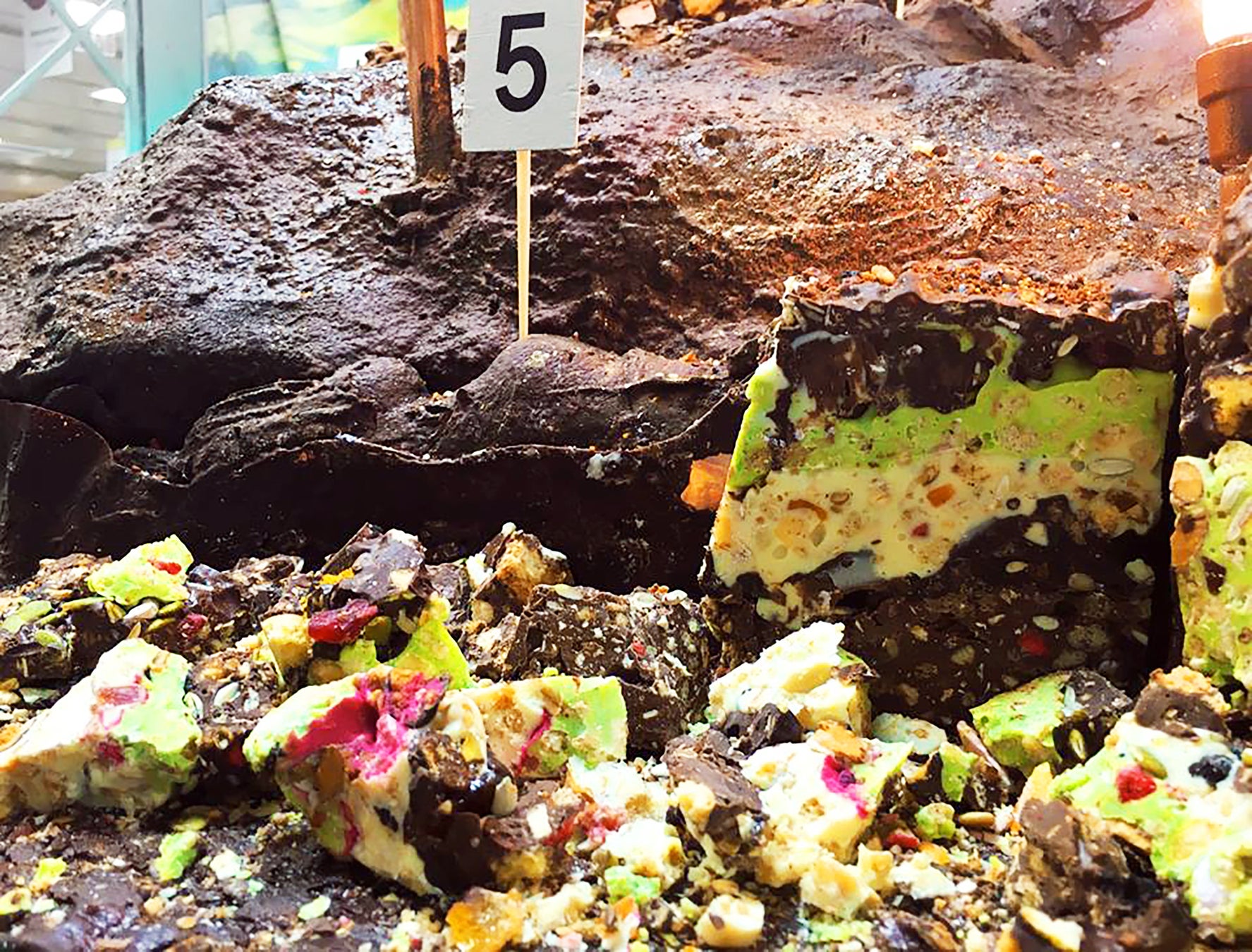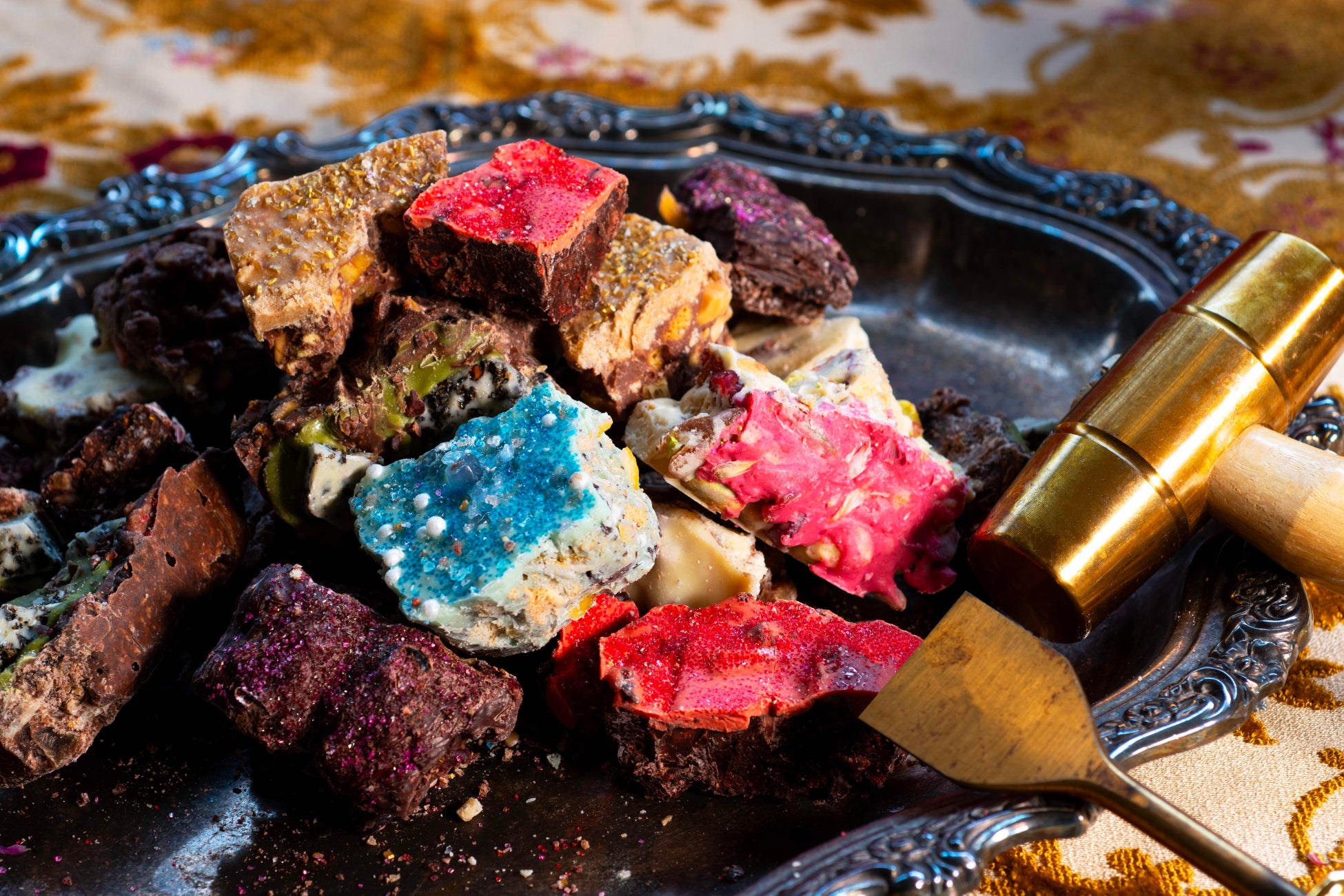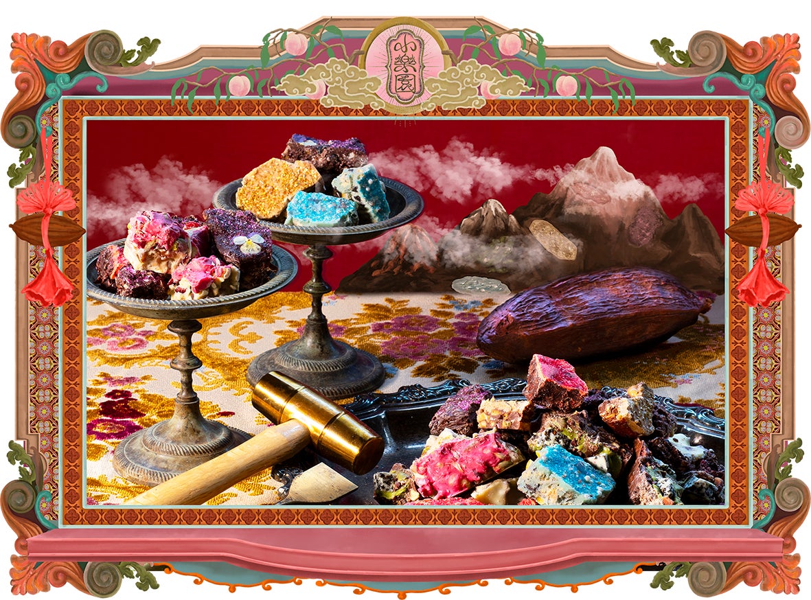 小楽園の巨大な「チョコレート山脈」は様々な珍山から成るチョコレートでできた山脈です。山脈マップをご覧いただきながら、お好きな山岳地帯をご選択、発掘員が山をその場で掘削し、瓶に詰めると、小楽園のからくり人形たちがお客様のもとまでお渡しに伺います。山脈内には、火山、花々の咲く高山地帯、桃源郷の山頂、氷の湖、神々の密林、熟成のバター砂漠、などさまざまな個性的な山岳地帯が存在し、まるでお伽噺のひとかけらのように、それぞれに異なる物語のチョコレートをお楽しみいただけます。