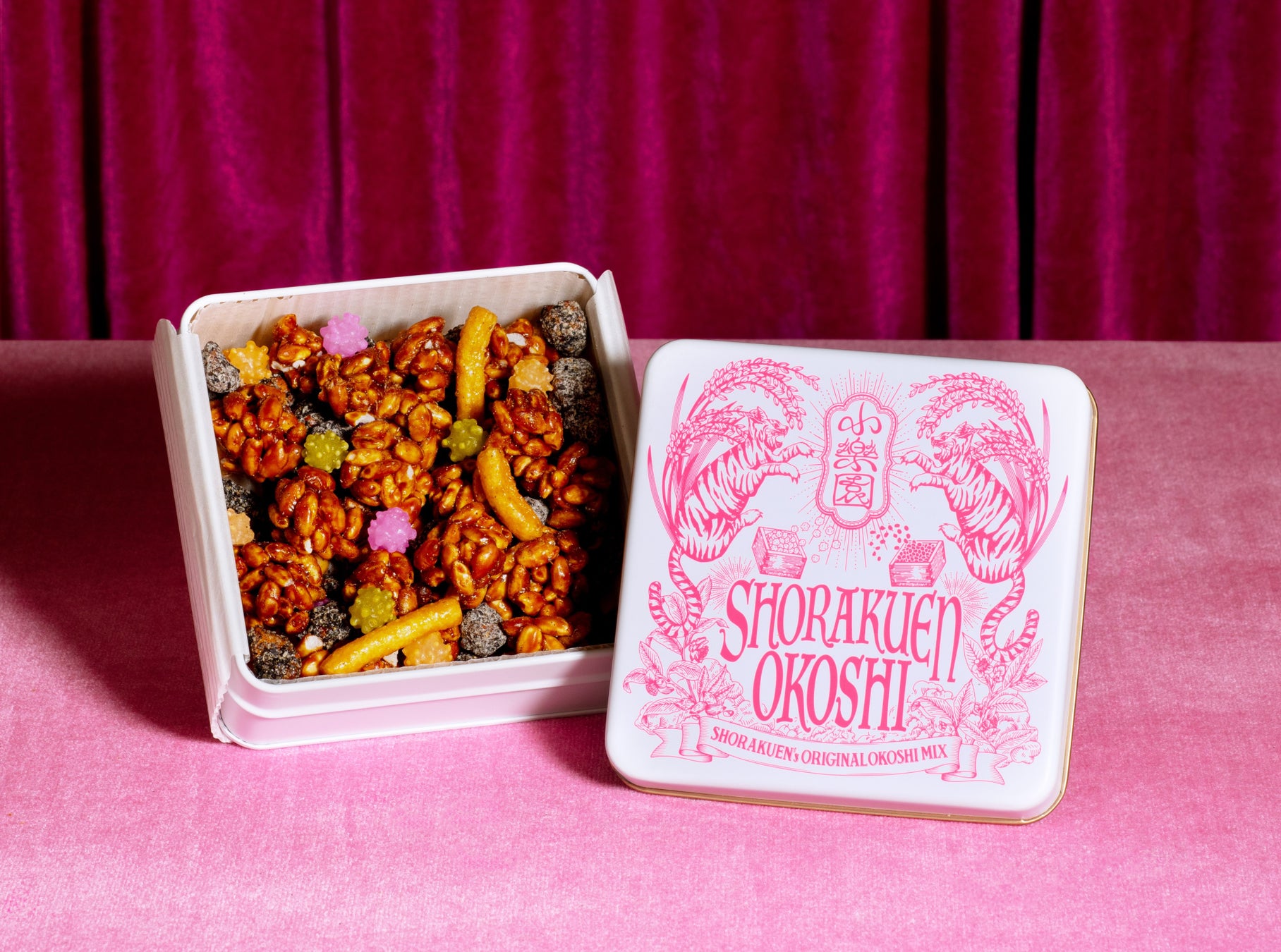 小楽園キッチンで丁寧にひとつひとつ制作している、オリジナルのおこしが入ったお菓子缶です。みたらし風味で甘しょっぱいカリカリが癖になる「小楽園のおこし」と、黒胡麻をまぶした香ばしい 3 種 のキャラメリゼナッツ。柚子胡椒風味のかりんとうに梅とニッキと抹茶の味の金平糖を詰め合わせました。