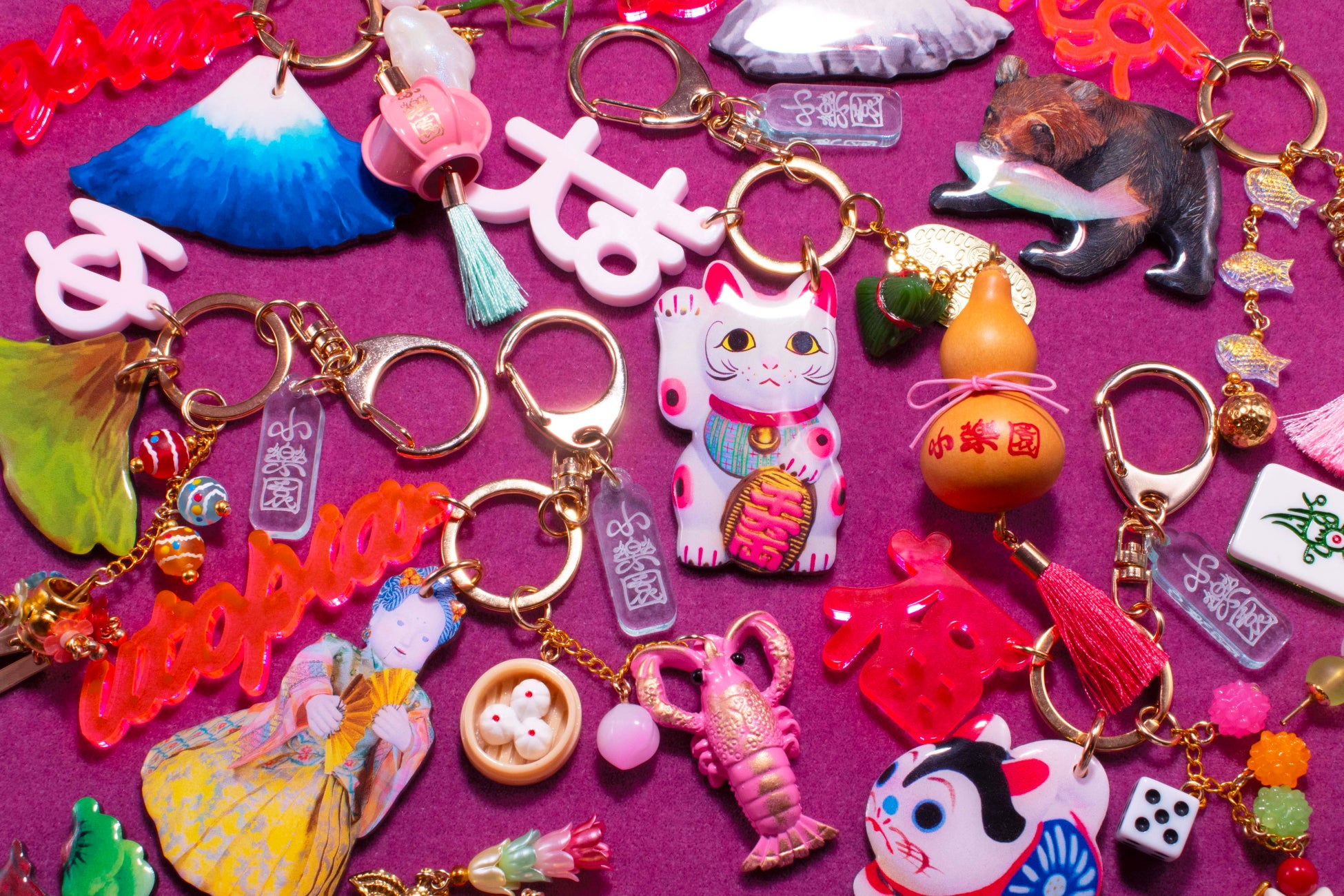 “桃源郷のお土産屋” に並んでいそうな…をコンセプトに作った小楽園の「OMIYAGE キーホルダー」。招き猫や松、信楽たぬきなどの日本らしいモチーフや、富士山をはじめとする日本の山々、瓢箪、茶運び人形などがモチーフに。日本らしくもどこか逆輸入したかのようなネジのはずれたテイストが小楽園らしい、アイコニックな楽しいコレクション。開運モチーフも多いので、ラッキーチャームとして持つのもおすすめです。