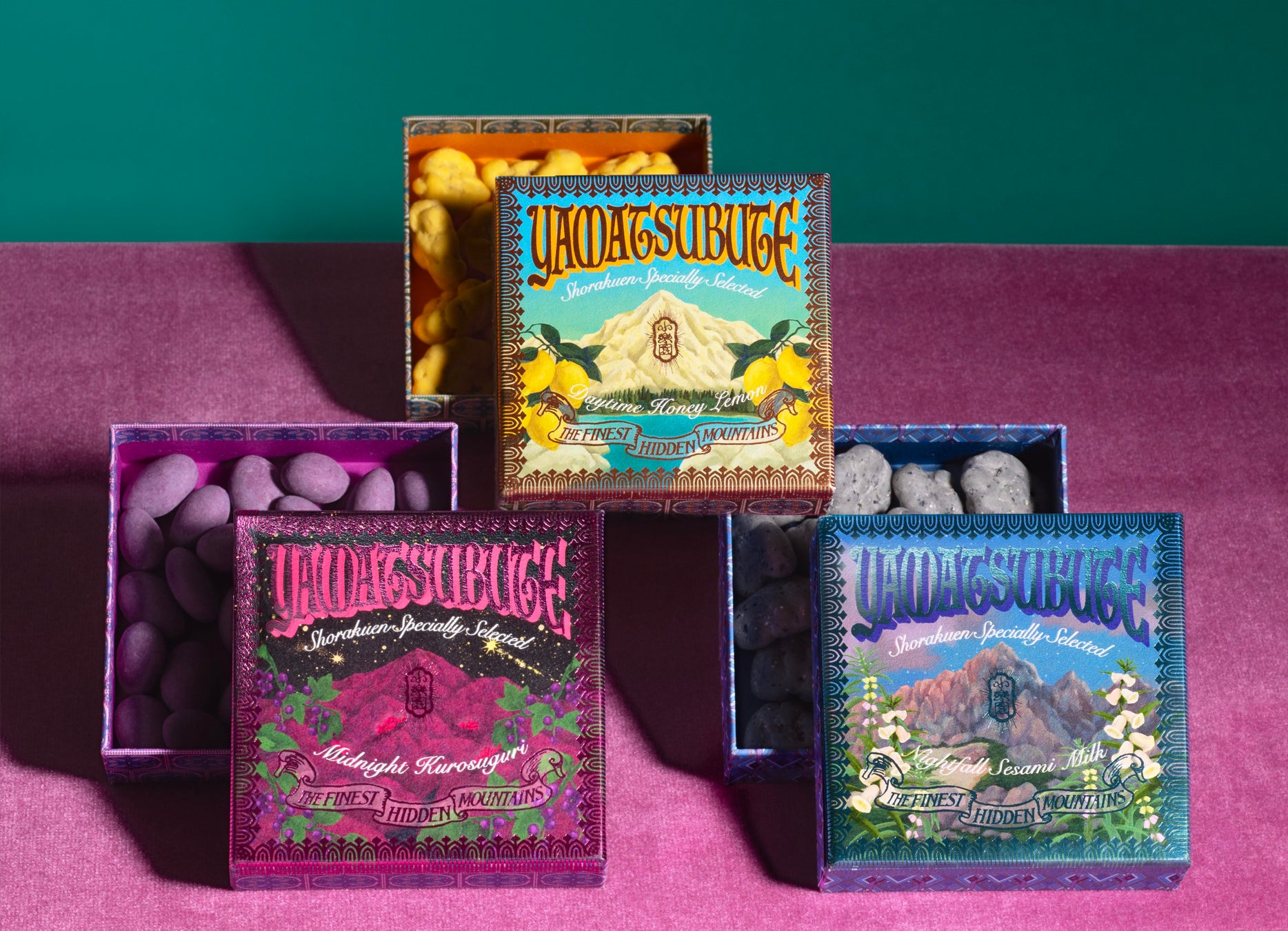 小楽園の珍山からこぼれ落ちた「礫(つぶて)」のようなチョコレート菓子、『YAMATSUBUTE/ 山礫』も箱菓子として新発売。特定の時間にしか現れない妖艶な山の表情をイメージした 3 種のフレーバーを、小楽園らしい華美で御伽噺の世界のような貼り箱に詰めてお届けいたします。