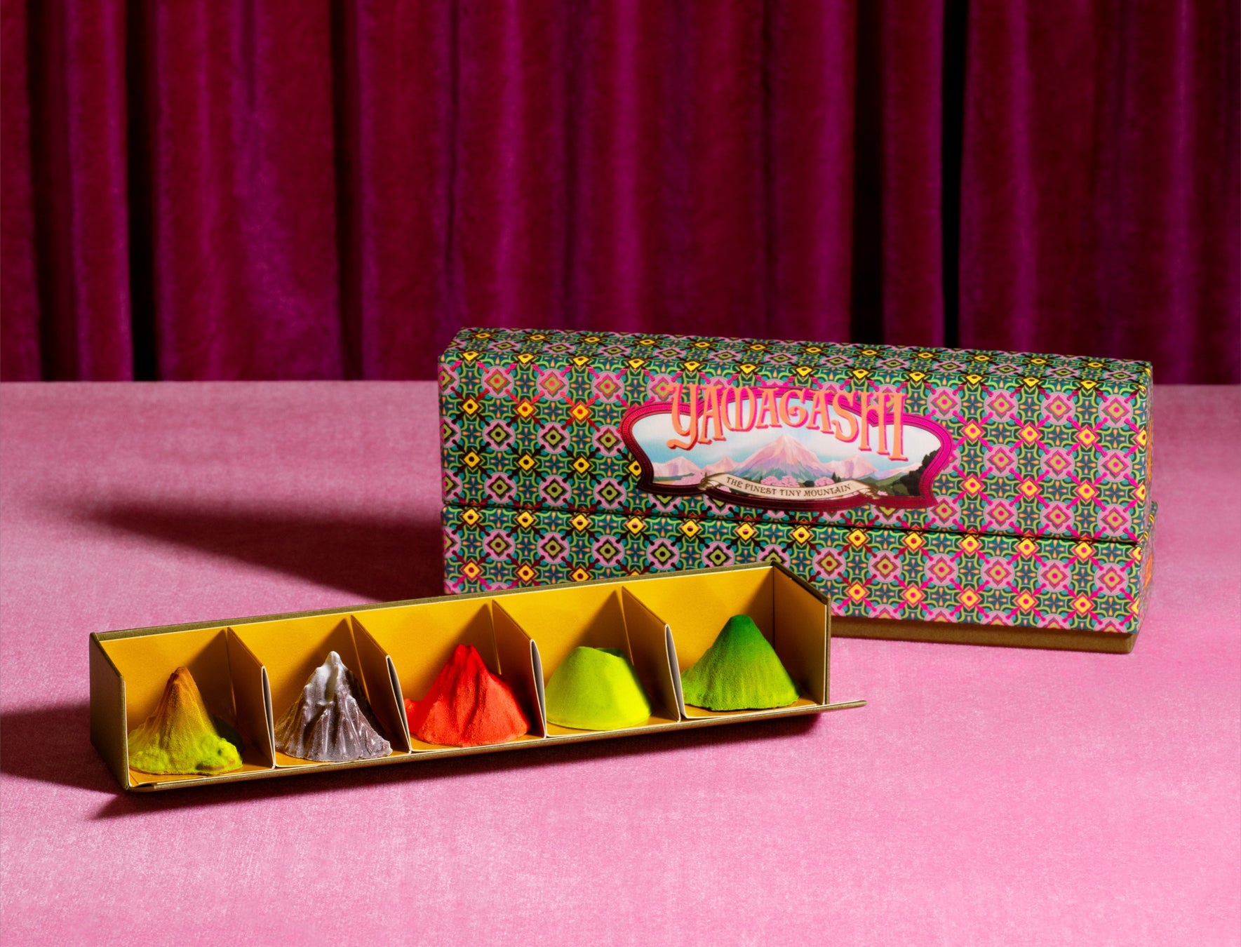 山菓子をさらに小さくした「雛山セット」もご用意。こちらは5山の味が味わえるボンボンショコラです。山好きの方やミニチュア好きの方にもおすすめな、御伽噺のような世界観で作る、新たな切り口の「日本のお菓子」です。