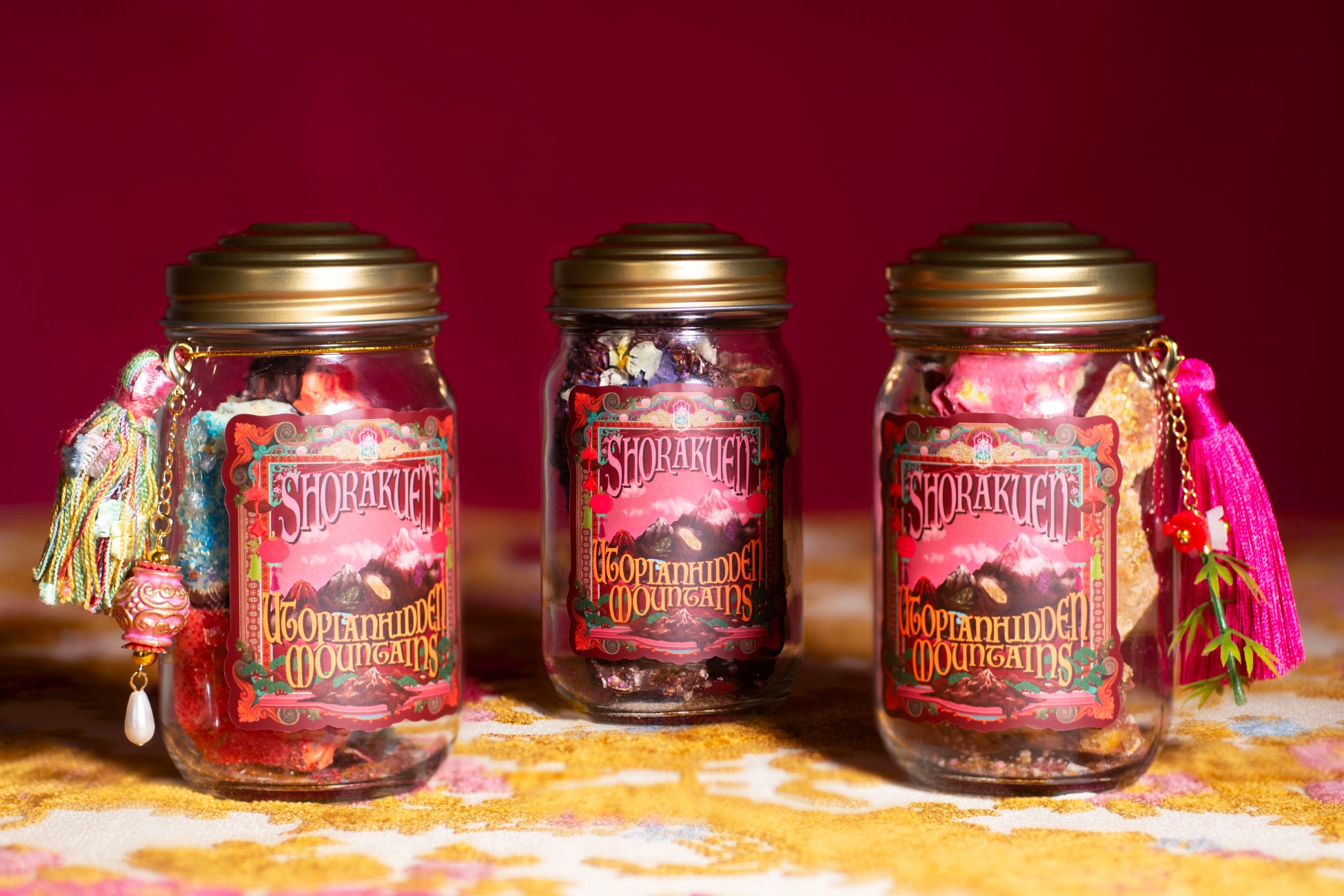 山のかけら瓶をカスタマイズできる、タッセルやオリジナルの小楽園チャームなど。