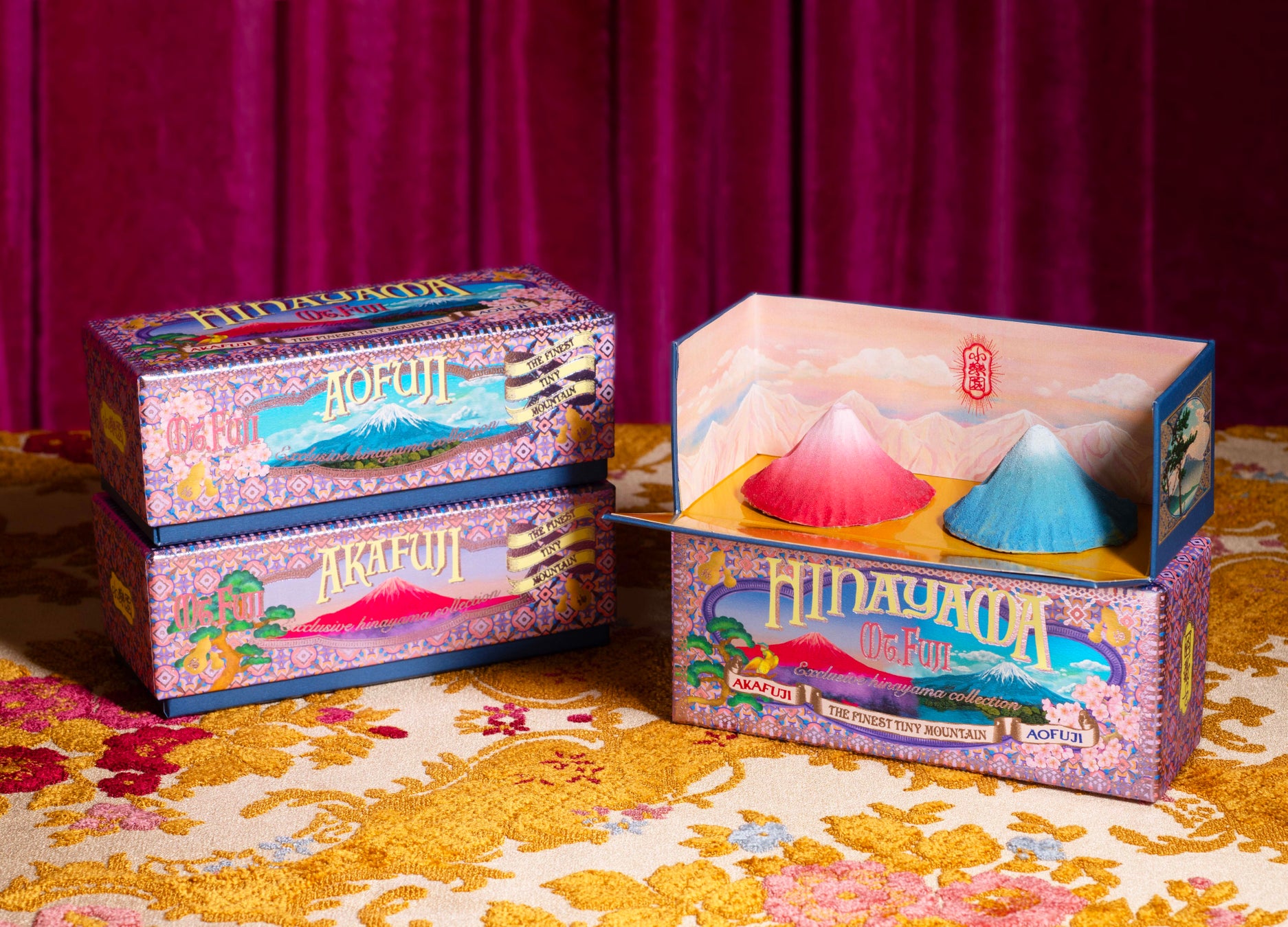 日本の最高峰を指のせサイズにした雛山富士山。晴れやかな空の下の「青富士」と、数多の偶然が重なって出逢える縁起の良い冠雪の「赤富士」の 2 個セットでご用意いたします。