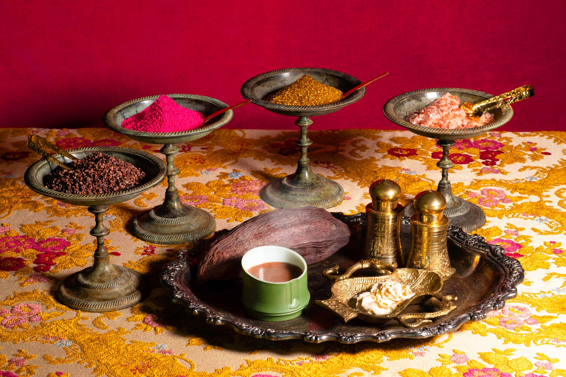 ホットチョコレートに乗せて楽しむトッピング。ホイップクリーム、エキゾチックな香りのアステカスパイス、桃色のトッピングシュガー、岩塩、香り付けのオレンジリキュールなどを少しずつ足して、お味を変えながら心ゆくまでお楽しみいただけます。