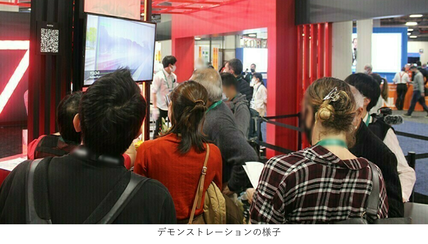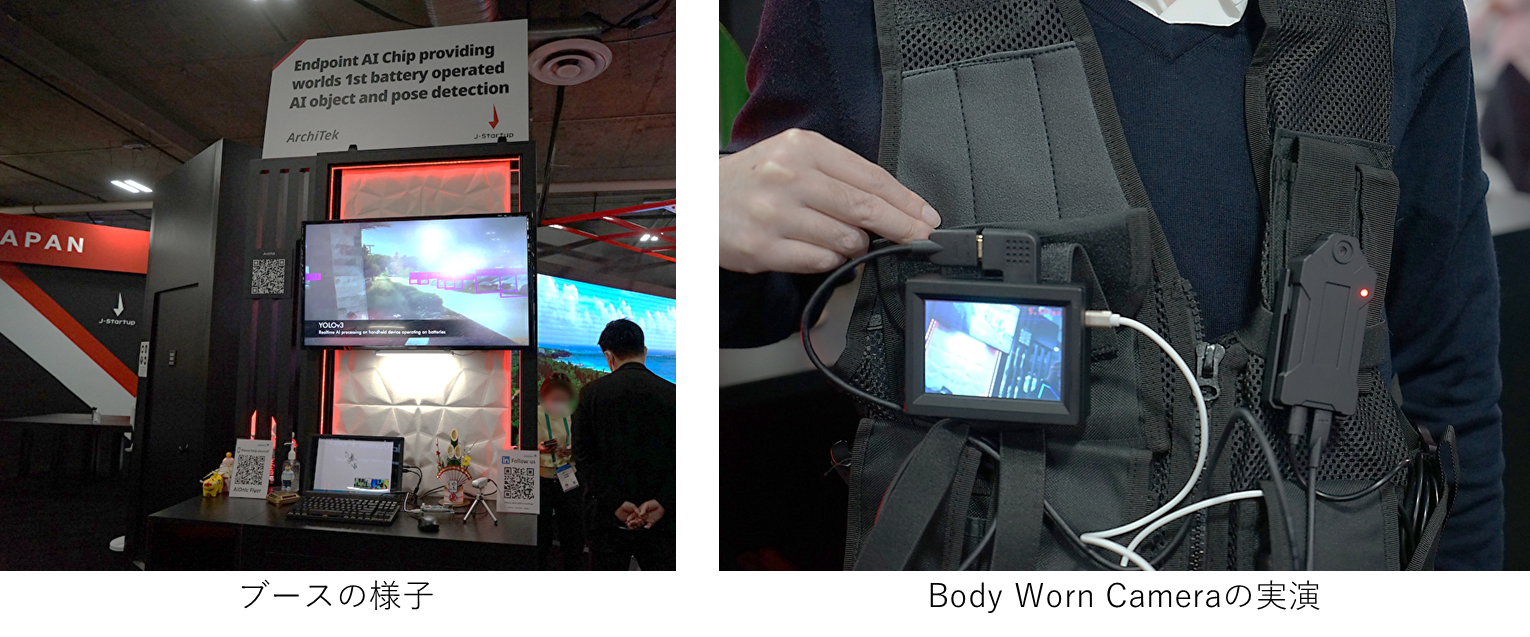 会場では試作LSI「beppu」を搭載した「AiOnIc®」AIカメラキットを米国の警察官が身に付けるBody Worn Cameraに模してデモンストレーションを実施し、通行者の姿勢推定や物体識別等のAI処理を行いました。エッジAI処理が行えることでクラウドとのデータ通信が不要であるため、通信および処理の遅延が少ないこと、デバイスのサイズが70mm × 38mm程度と小型であること、モバイルバッテリーで動作可能な電力性能について反響があり、来場者の皆さまから今後の量産化について更なる期待のお声をいただいております。試作LSI「beppu」によるSLAM処理においても同デバイスにて処理を行った情報をモニターに表示させる等のデモンストレーションを実施しました。今回の出展では世界各国の来場者の皆さまに当社の技術および開発力に関心を持っていただく機会となりました。