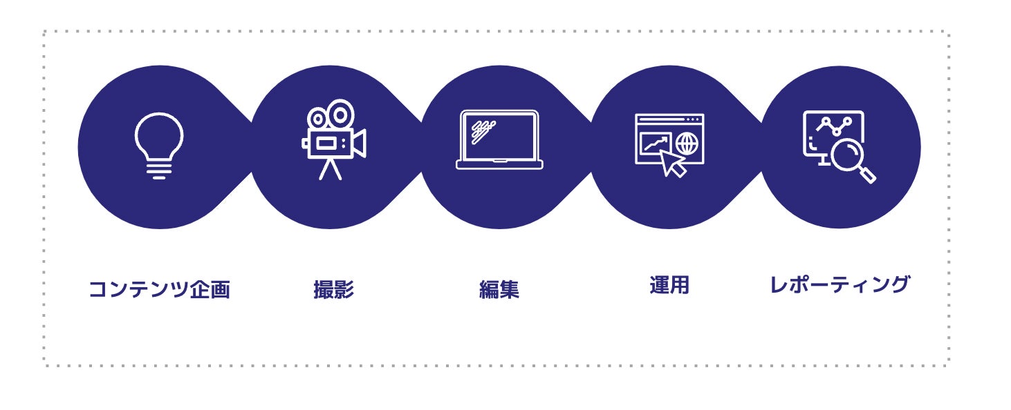 「コンテンツ企画⇨撮影⇨編集⇨運用⇨レポーティング」の一気通貫のご支援が可能となっております。