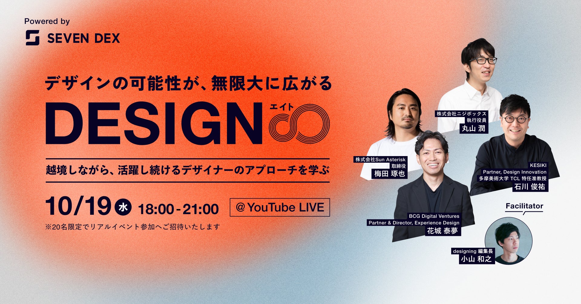 株式会社セブンデックス(代表取締役:中村伸啓、堀田信治)は、10月19日(水)に、スペシャルイベント「デザイン∞(エイト)」をオンライン/オフライン合同で開催いたします。