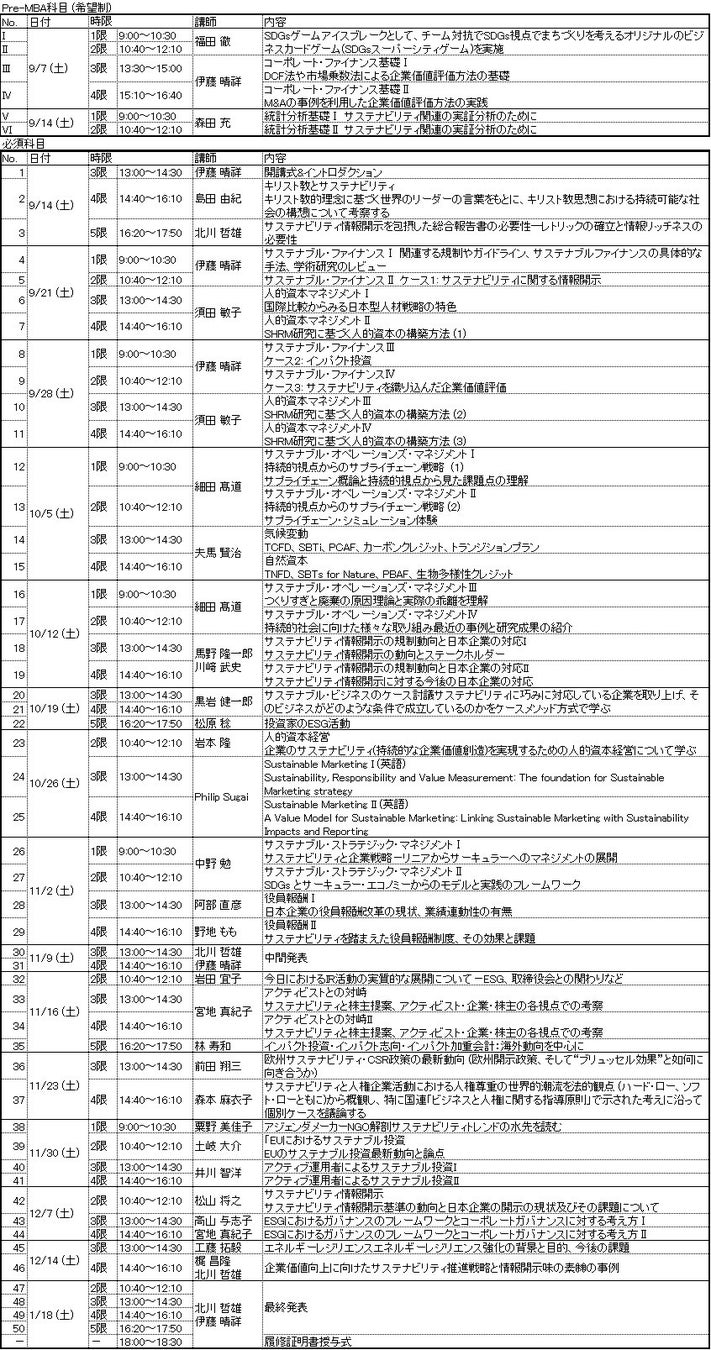 開講期間:2024年9⽉7⽇〜2025年1⽉18⽇ 全56回 (うちPre-MBA科目6回(選択制)、中間報告2回、最終報告4回)