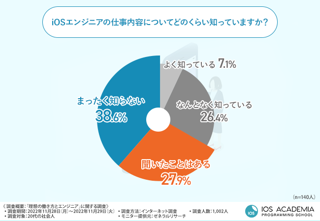 「iOSエンジニアの仕事内容についてどのくらい知っていますか?」と質問したところ、半数以上の方が『聞いたことはある(27.9%)』『まったく知らない(38.6%)』