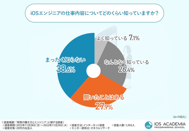「iOSエンジニアの仕事内容についてどのくらい知っていますか?」と質問したところ、半数以上の方が『聞いたことはある(27.9%)』『まったく知らない(38.6%)』