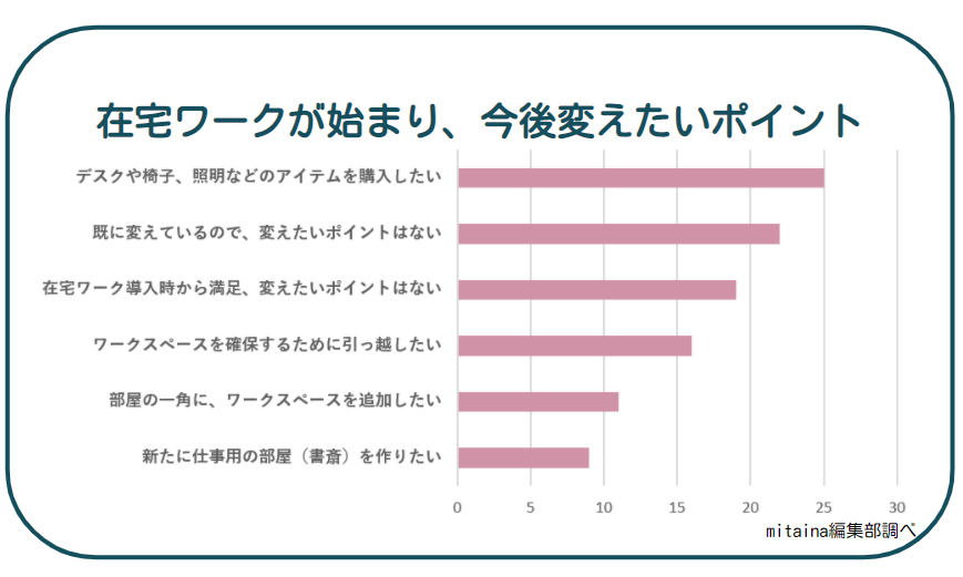 緊急事態宣言が明けた今でも、9割以上の人が週1日以上在宅ワークを続けているということで、実際に住まいで変えたポイントと、これから変えたいポイントについて深堀していきましょう。