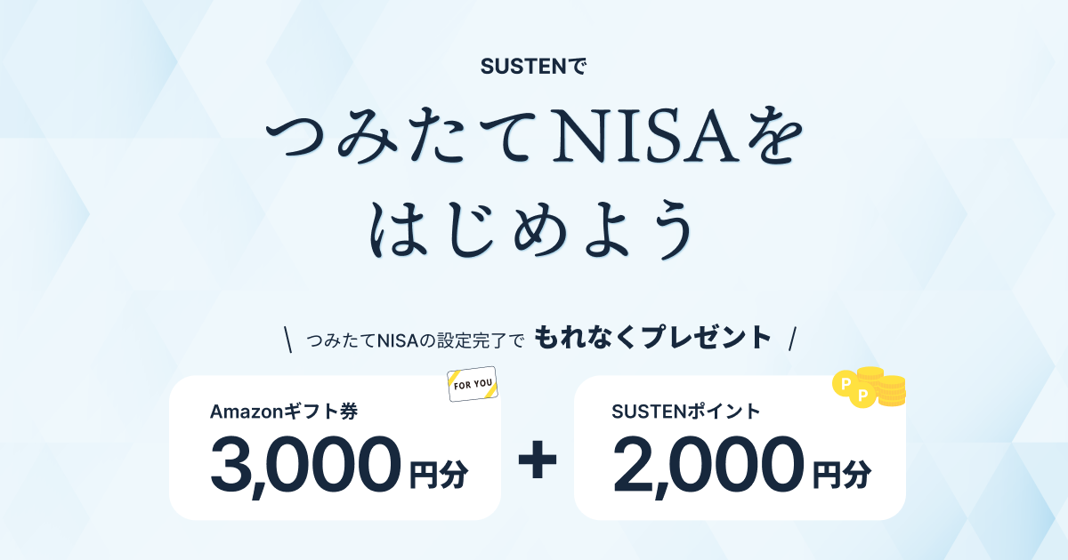 新サービス開始を記念して、キャンペーン期間中にエントリーし、つみたてNISAの口座開設&取引設定を行っていただいた方全員に、もれなくAmazonギフト券3,000円分SUSTENポイント2,000円分をプレゼントいたします。