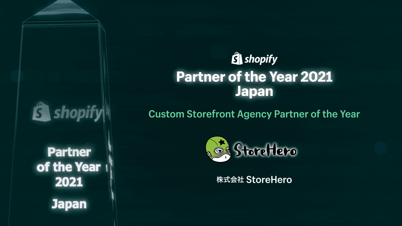 株式会社StoreHero(本社:東京都渋谷区、代表取締役:黒瀬淳一、以下StoreHero)は、2021年11月4日(木)Shopify Japanが主催するCOMMERCE DAY 2021の中で開催されたShopify Partner of the Year 2021- JapanにてCustom Storefront Agency Partner of the Yearを受賞しました。この賞は、Shopify(ショッピファイ)で最もUXが優れたカスタムストアフロントをマーチャントのために構築しビジネス成長に大きく貢献したパートナーに贈られます。