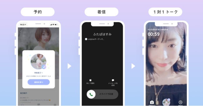 onlyliveはYouTuberやモデル、芸人・アーティスト・インフルエンサーなどをはじめとしたタレントと、1対1でオンライントークができるサービスです。予約時間になるとファンのスマートフォンへタレントからの着信が鳴り、2人きりの通話を楽しむことができます。タレント・ファンともに音声のみ配信にも対応しています。