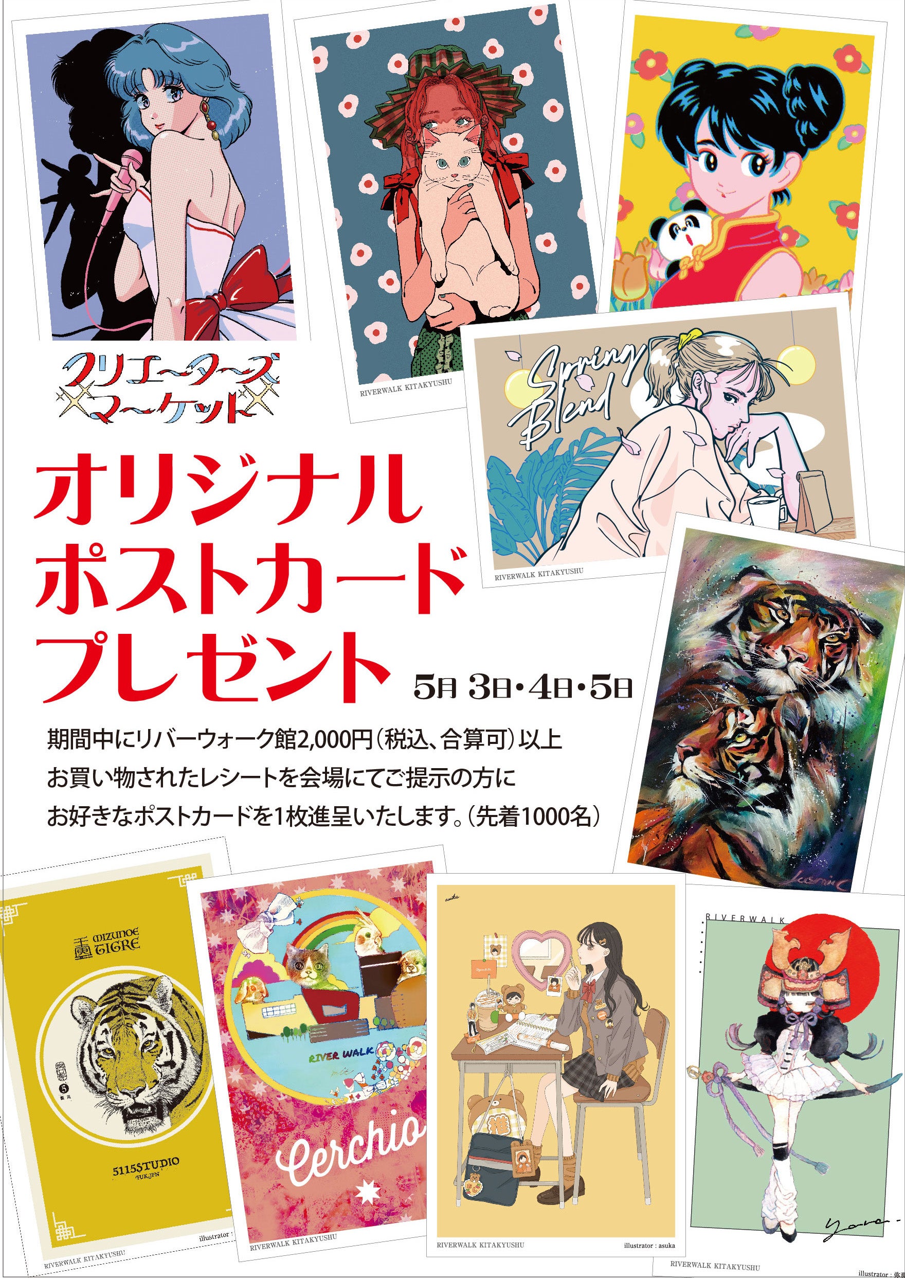 【特典】期間中にリバーウォーク館内で2,000円(税込、合算可)以上のお買い物をされたお客様が会場でレシートをご提示いただくと、クリエーター作品のオリジナルポストカードを進呈致します。