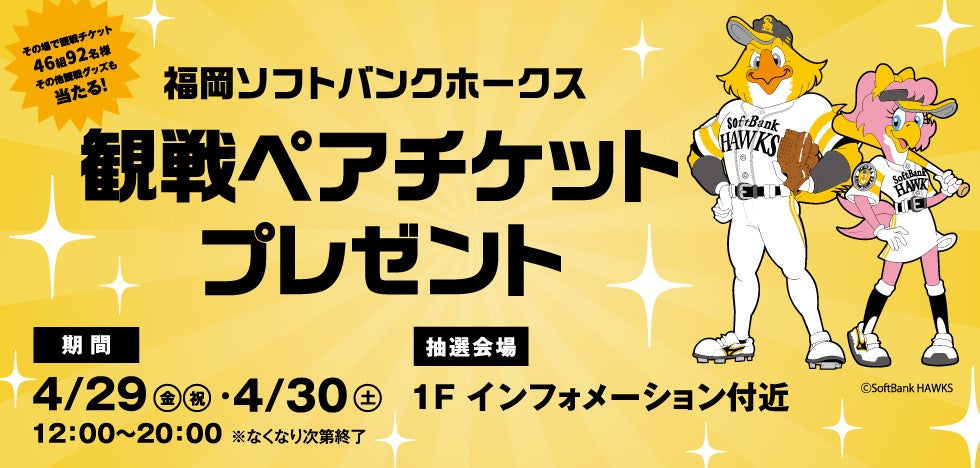 当日の館内お買上げレシート2,000円分(税込、合算可)をご提示いただくと、福岡ソフトバンクホークスのチケットや応援グッズがあたる抽選に1回チャレンジいただけます。お買物の際はぜひご参加ください。